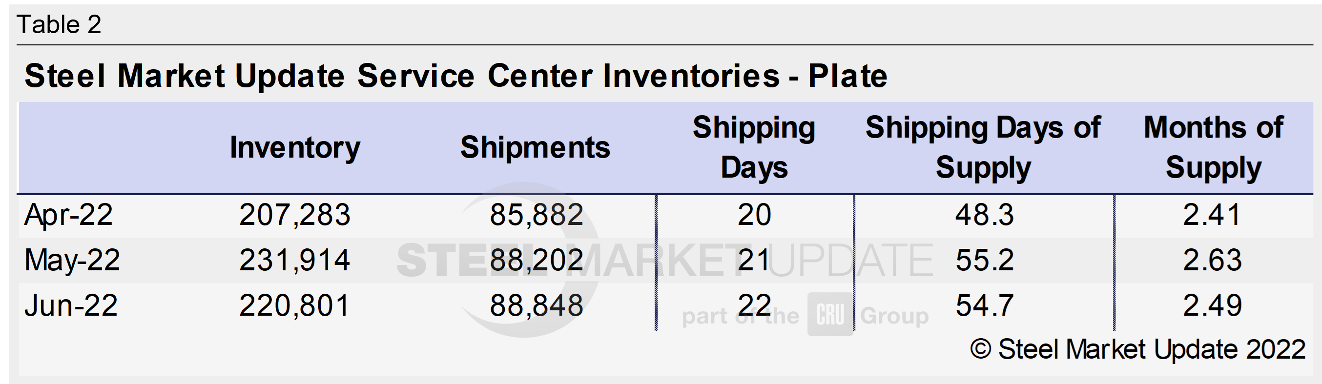US service center plate inventories decreased in June. Stable shipments contributed to the number of shipping days of plate supply falling to 54.7 days in June. In May, service centers carried 55.2 shipping days of supply. Supplies in June represented 2.49 months on hand, down from 2.63 months in May.
