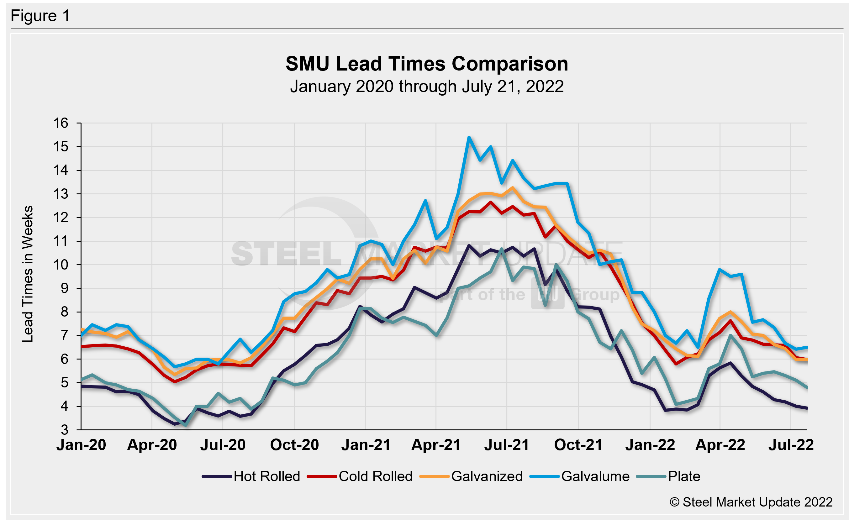 Steel mill lead times through this week were relatively flat for sheet products and down slightly for plate, according to SMU’s latest market check. On average this week, lead times declined by 0.1 weeks across the board compared to early July and are down an average of 0.4 weeks compared to one month ago. Having gradually declined from the April peak, July lead times remain in line with early 2022 levels.