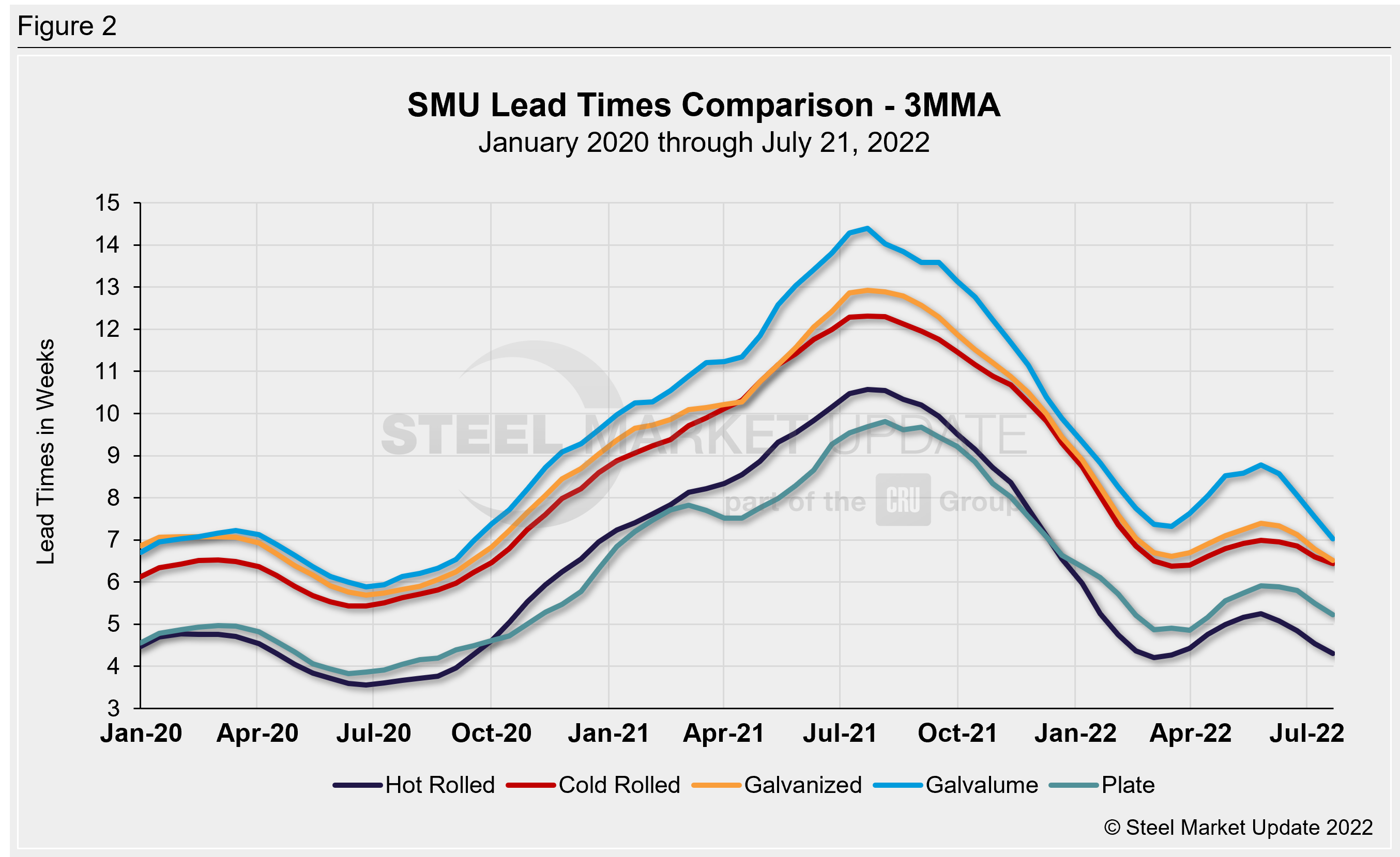 Looking at lead times on a three-month moving average can smooth out the variability in the biweekly readings. As a 3MMA, all products were down between 0.2–0.5 weeks compared to two weeks prior and down as much as one full week compared to mid-June. The current 3MMA for hot rolled is down 0.2 weeks to 4.3 weeks, cold rolled eased 0.2 weeks to 6.4 weeks, galvanized is down 0.3 weeks to 6.5 weeks, Galvalume declined 0.5 weeks to 7.0 weeks, and plate slipped by 0.3 weeks to 5.2 weeks.