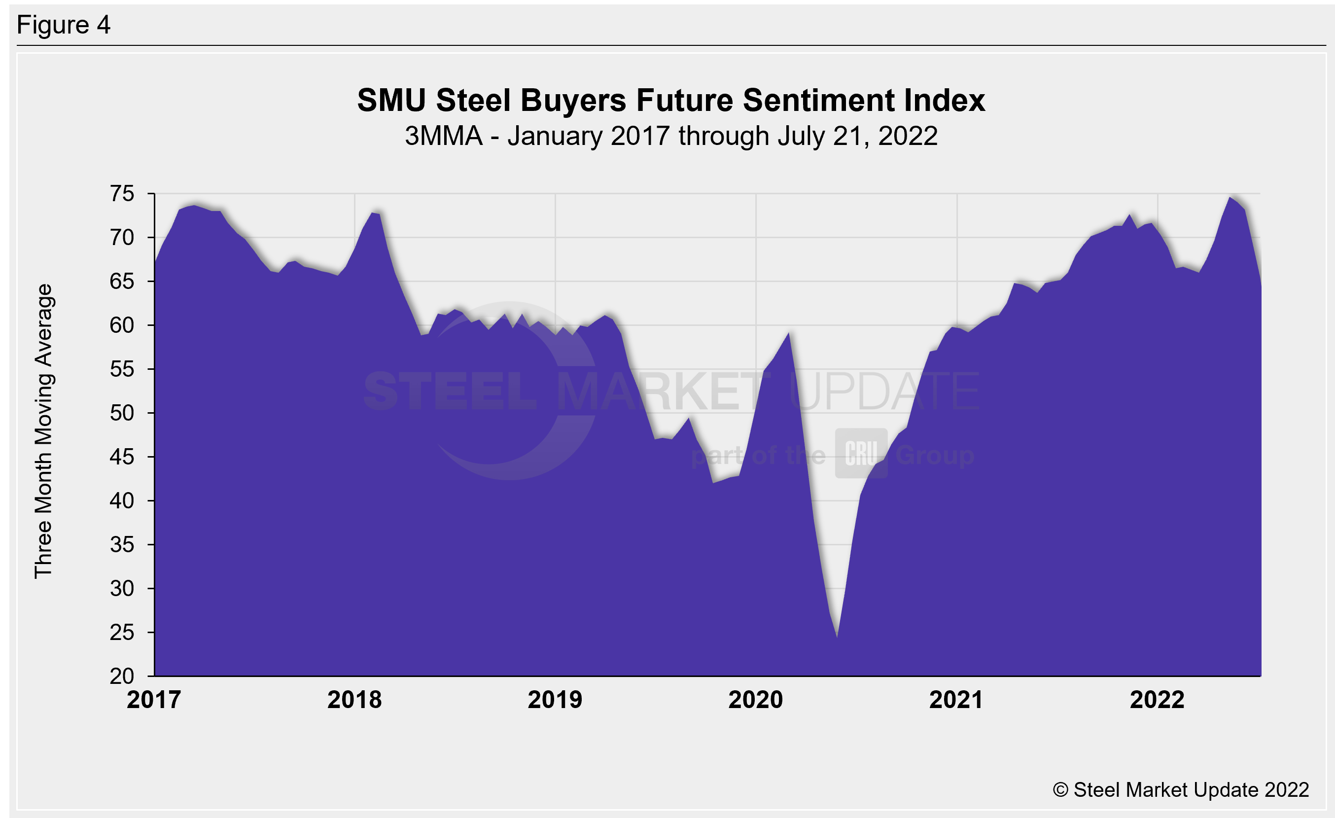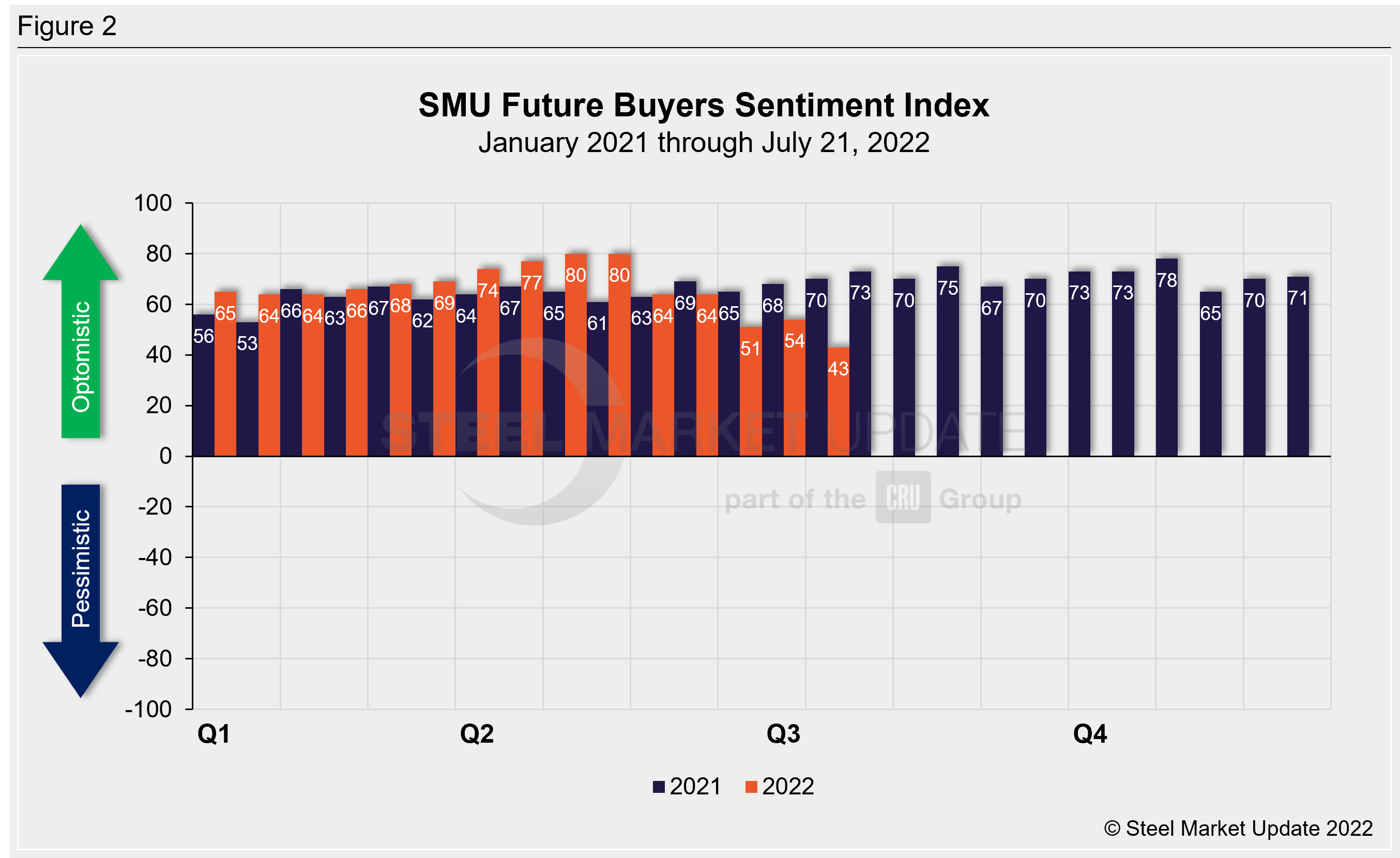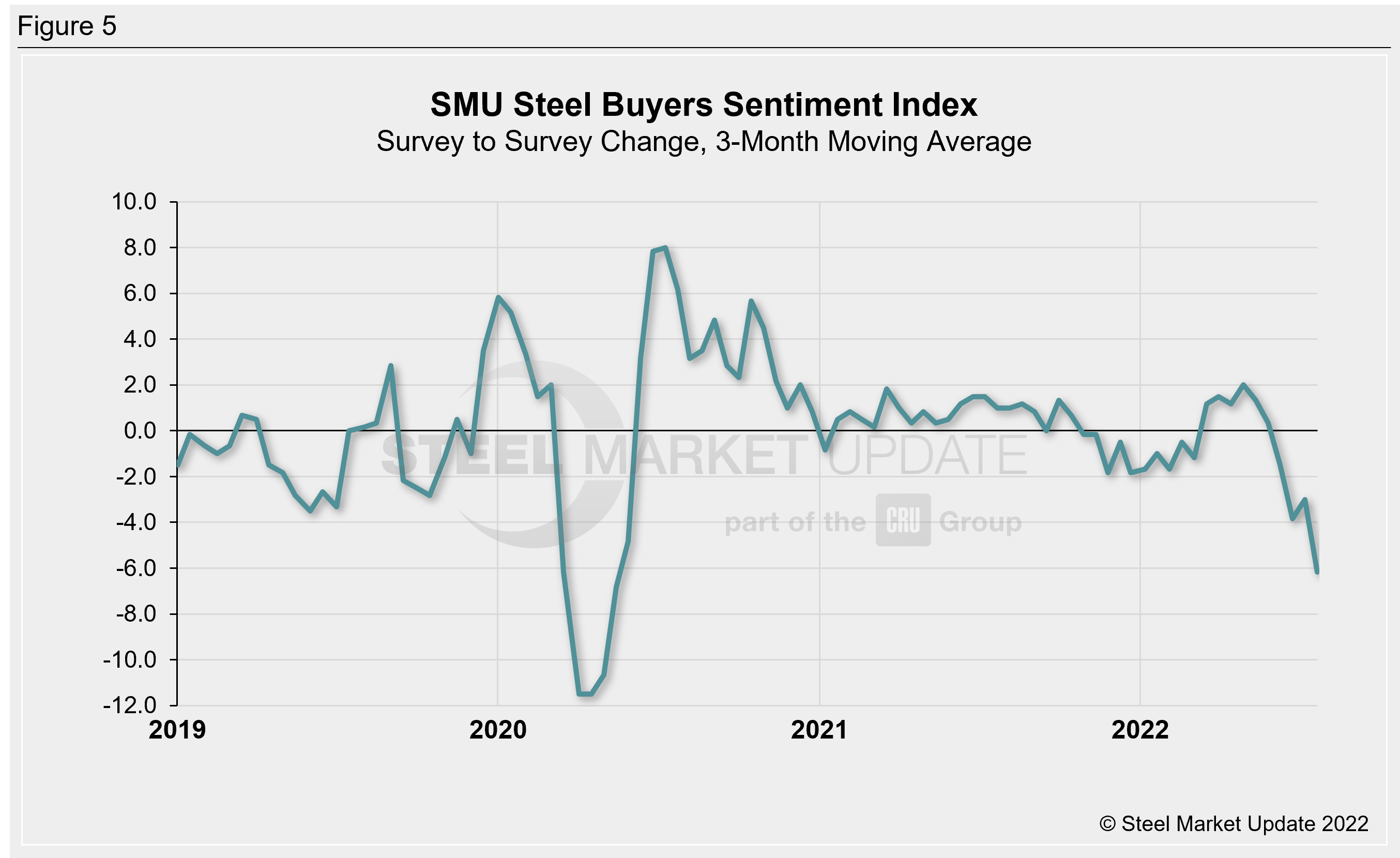 SMU surveys steel buyers every other week and asks how they view their chances of success in the current market and a few months down the road. SMU’s Buyers Sentiment Index registered +43 this week, down 17 points from two weeks prior and down 39 points from the late-March high (Figure 1). This is the largest survey-to-survey change in our Sentiment Index since April 2020.