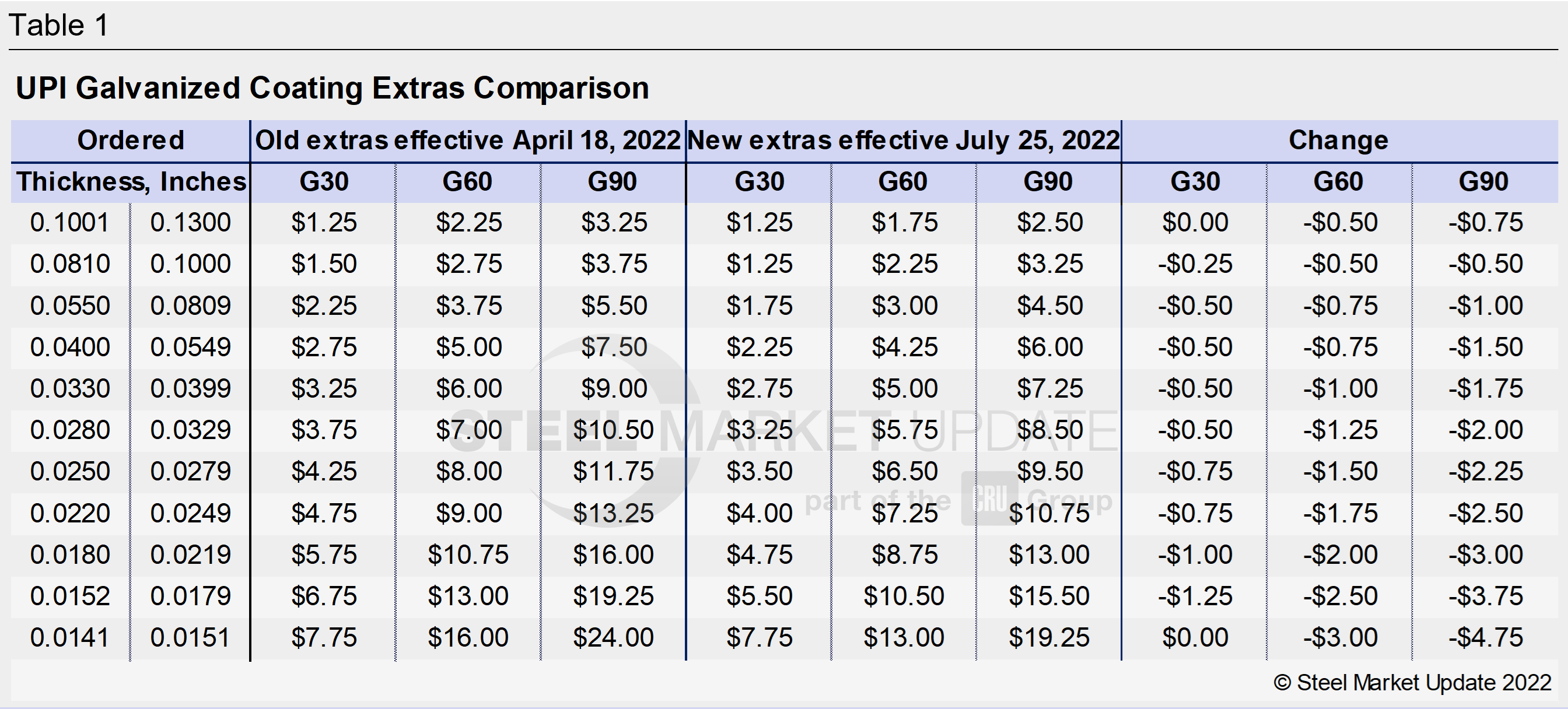 SMU has analyzed the old and new galvanized extras below. Select UPI extras decreased as much as 23%, with an average decrease of 17%. UPI extras were previously revised on April 18, 2022.