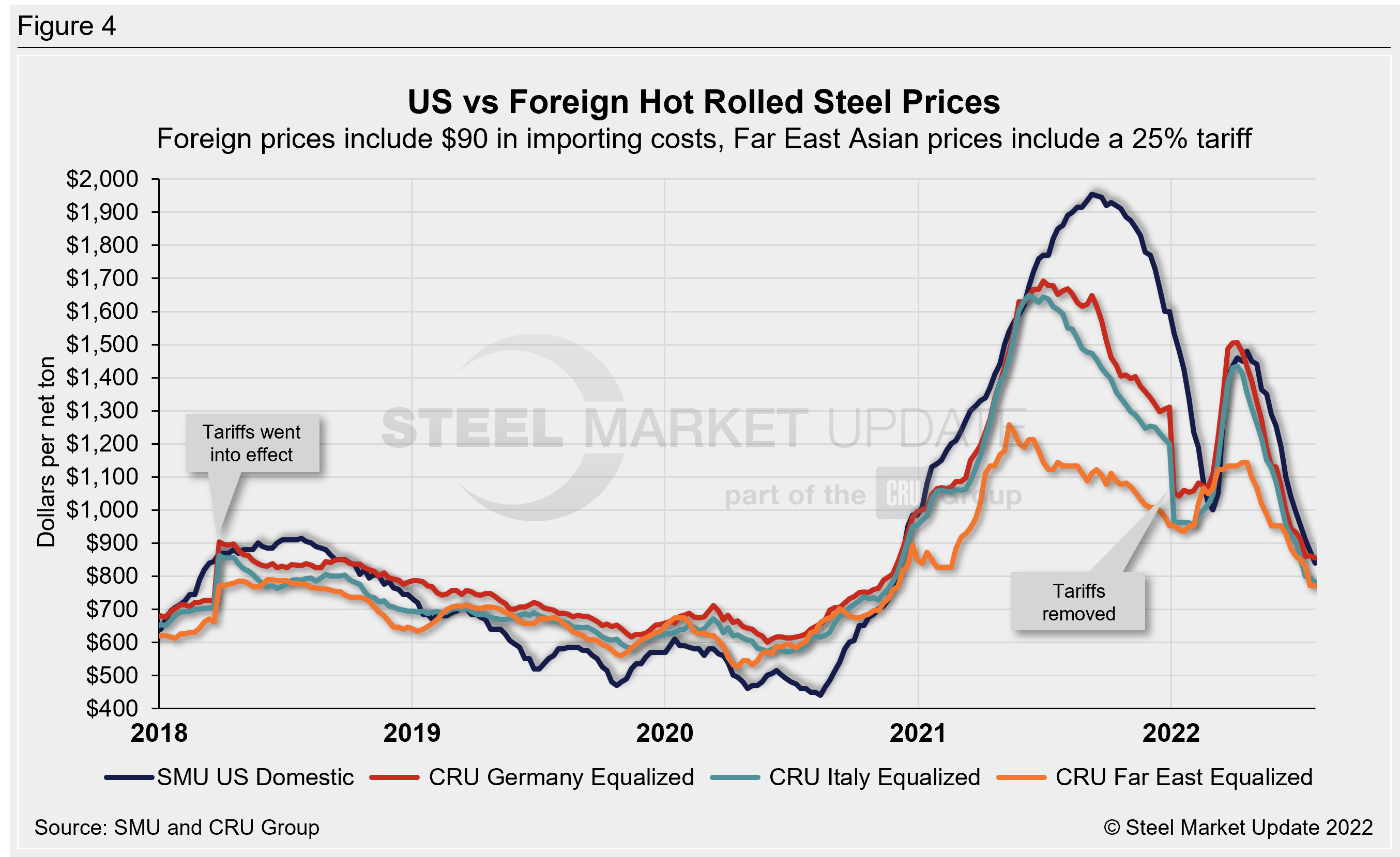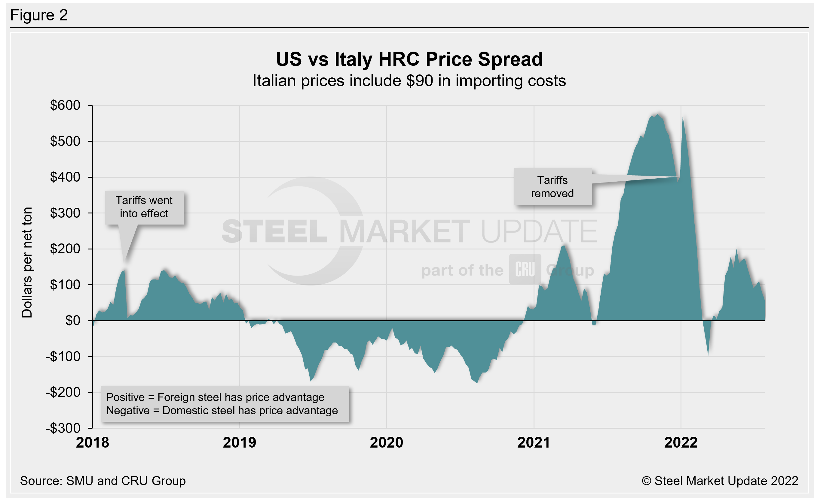 CRU published Italian HRC prices at $692 per net ton ($763 per metric ton), down $12 per ton from last week and down $122 per ton from one month ago. After adding import costs, the delivered price of Italian HRC is approximately $782 per ton. Accordingly, domestic HRC is now theoretically $58 per ton more expensive than imported Italian HRC, down from $81 per ton one week prior and down from $91 per ton four weeks ago. The highest spread this year was $200 per ton in mid-May. This is the 19th consecutive week foreign steel prices have held this price advantage. Prior to removal of the 25% Section 232 tariff, the November 2021 spread of $577 per ton was the largest in SMU’s data history.