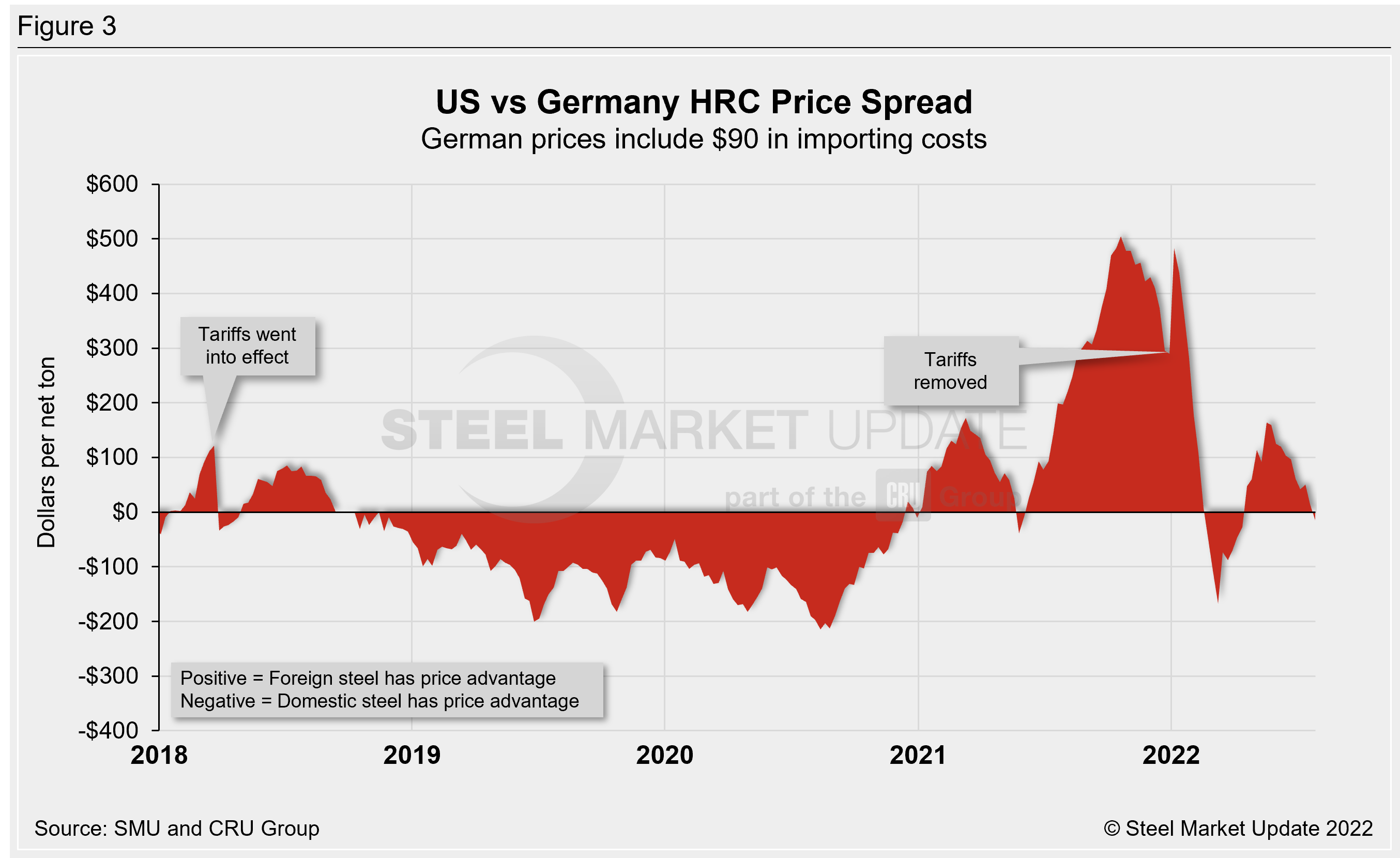 The latest CRU German HRC price is $765 per net ton ($843 per metric ton), down $6 per ton from last week and down $79 per ton from one month ago. After adding import costs, the delivered price of German HRC is approximately $855 per ton. Accordingly, domestic HRC is now theoretically $15 per ton cheaper than imported German HRC. Prior to this week, German prices held this price advantage for 14 consecutive weeks; the spread was $14 per ton one week prior, $61 per ton four weeks ago, and had reached a 2022 high of $164 in mid-May. Prior to removal of the 25% tariff, the October 2021 spread of $504 per ton was the largest seen in SMU’s data history.