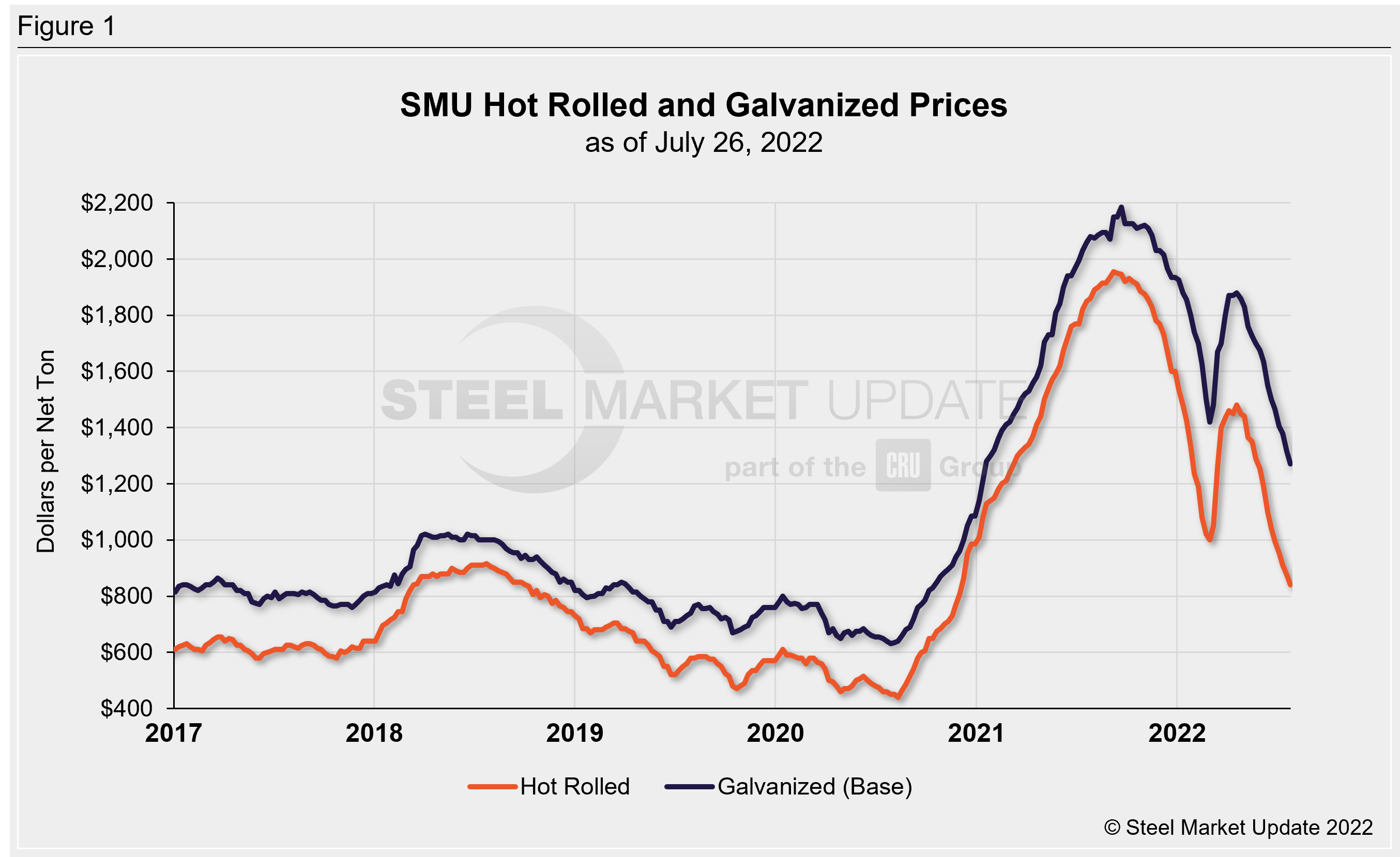 SMU’s hot rolled coil price averaged $840 per ton last week and has declined each of the past 14 weeks. Recall our index had reached a 14-month low of $1,000 per ton in the first week of March, following a record-high $1,955 per ton in September 2021. Our latest galvanized price index averaged $1,270 per ton ($63.50 per cwt) last week and has also decreased for the last 14 weeks. Galvanized prices peaked at $2,185 per ton last September and fell to a 12-month low of $1,420 per ton in early March.