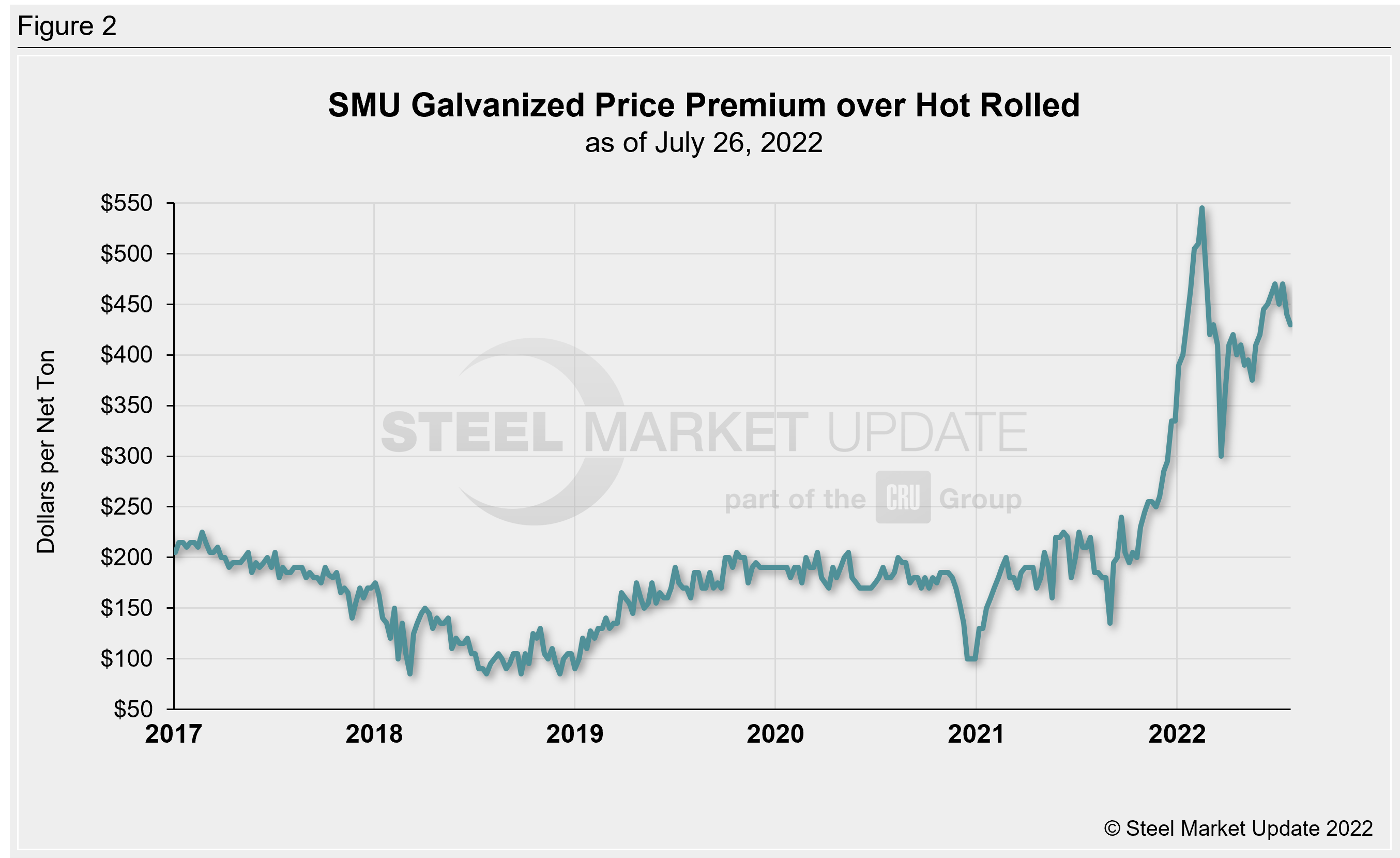 As shown in the graph below, galvanized held a premium of $80-$220 per ton over hot rolled for the last few years, exceeding that range in late 2021. Recall the premium rapidly rose to a peak of $545 per ton in mid-February, falling almost as quickly thereafter to reach a low of $300 per ton on March 22. The premium last week was $430 per ton, a seven-week low. The average premium in July was $448 per ton, compared to $456 per ton in June and $400 per ton in May.