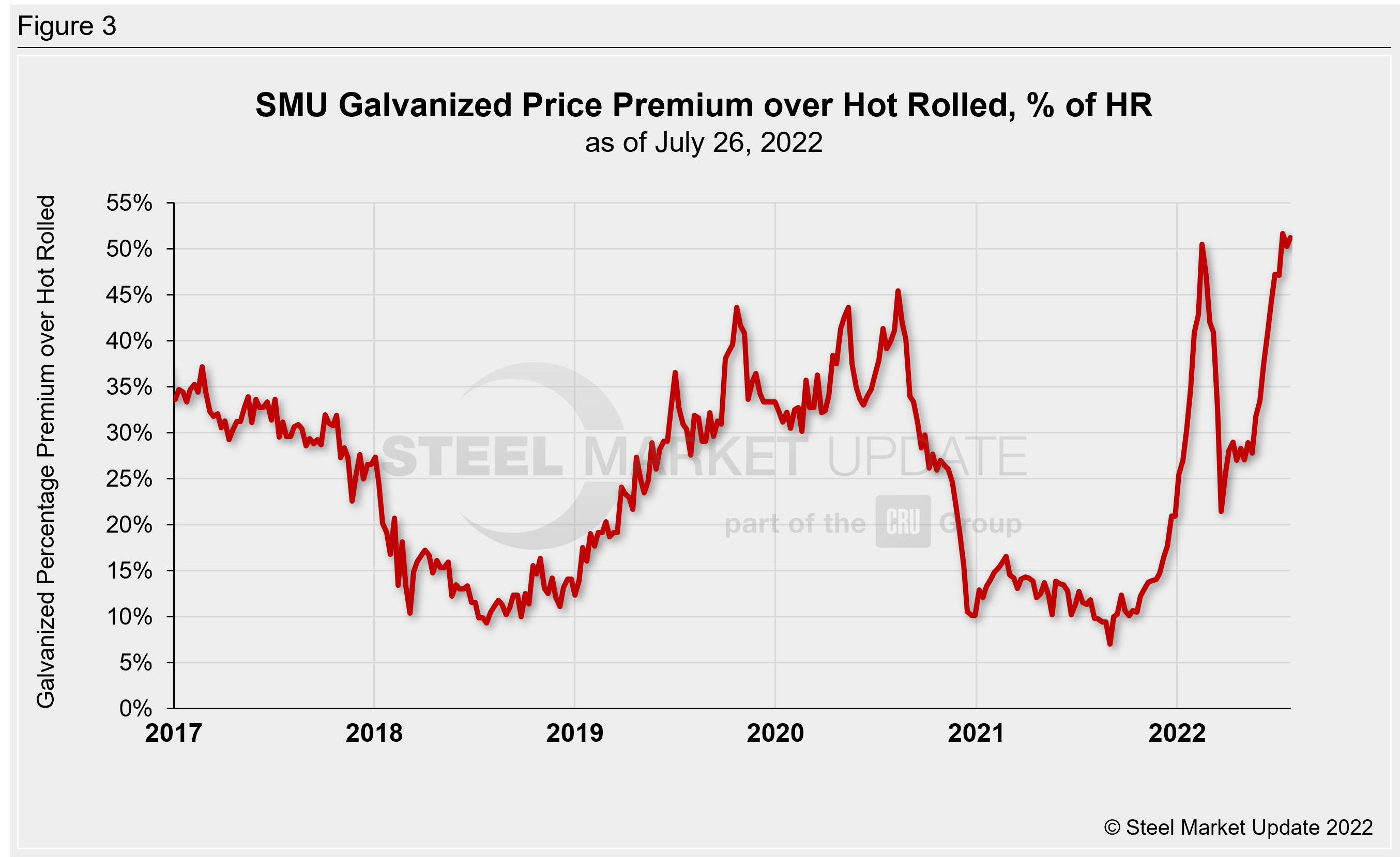 To better compare this price spread, we graphed the galvanized price premium over hot rolled as a percentage of the hot rolled price. This is an attempt to paint a clearer comparison against historical pricing data. As shown in the graphic below, the percentage premium is not as alarming compared to the dollar value premium, but it is still significantly higher compared to most past cycles. Galvanized prices held an average premium of 24% above hot rolled prices from 2017 through the end of 2021. In 2021, that premium averaged just 13%, while 2022 YTD now averages a 36% premium through last week. The premium rose to a (then) record high in mid-February 2022 of 50%. We surpassed that high in mid-July at 52%. The latest premium (51%) remains near that high. The average premium in July was 50%, up from 42% in June and 30% in May.