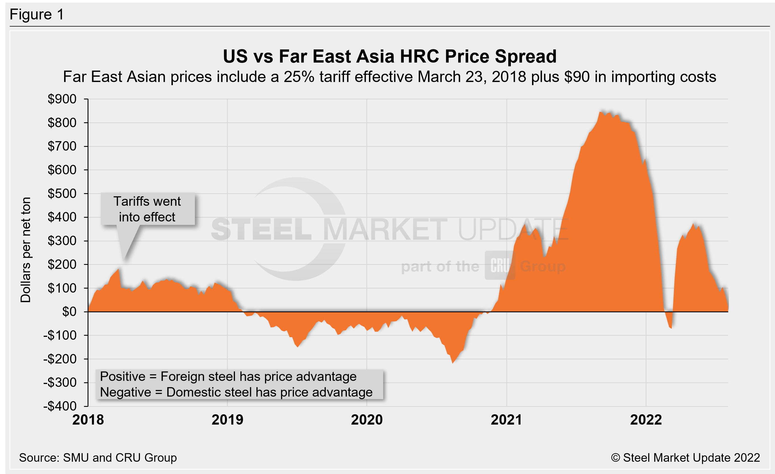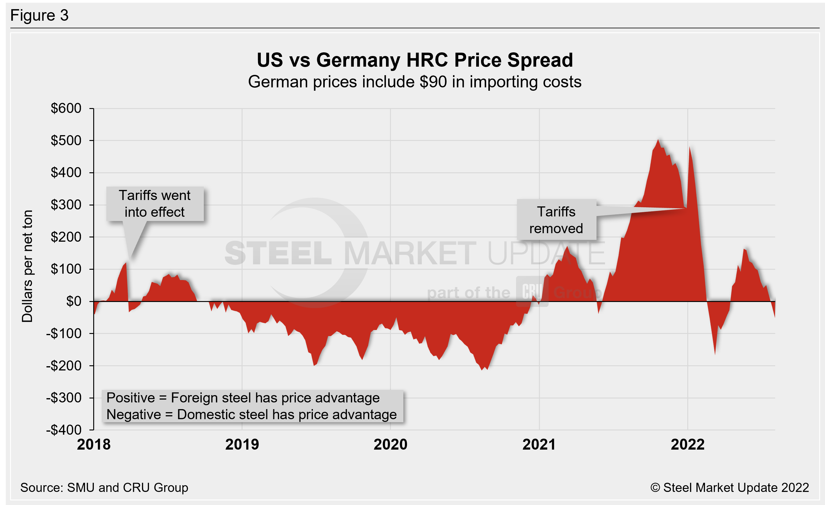 The latest CRU German HRC price rose $2 per ton from last week to $767 per net ton ($846 per metric ton), down $56 per ton from one month ago. After adding import costs, the delivered price of German HRC is approximately $857 per ton. Accordingly, domestic HRC is now theoretically $52 per ton cheaper than imported German HRC, up from $15 per ton one week ago. Prior to last week, German prices held a price advantage for 14 consecutive weeks; the spread was $42 per ton four weeks ago (meaning German imports were cheaper that domestic steel), and had reached a 2022 high of $164 in mid-May. Prior to removal of the 25% tariff, the October 2021 spread of $504 per ton was the largest seen in SMU’s data history.