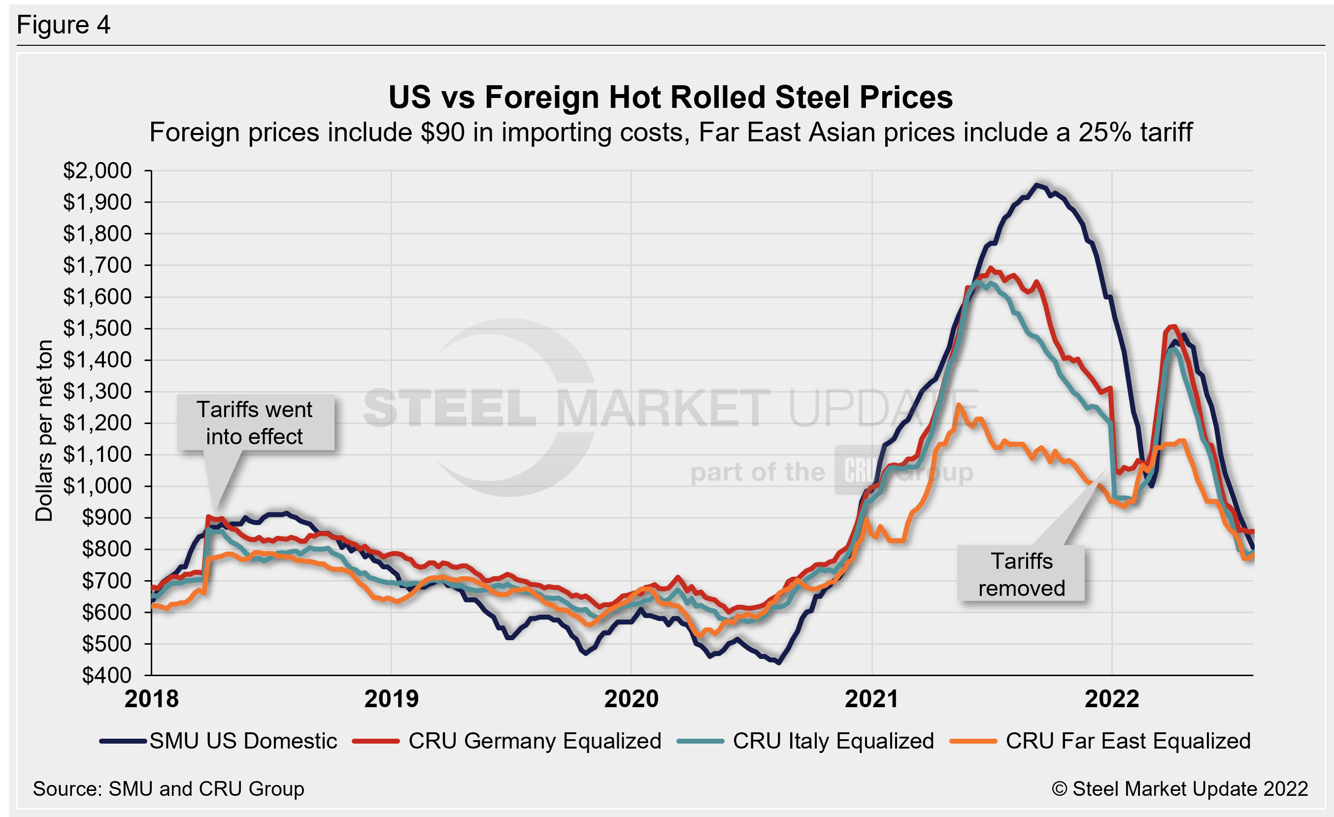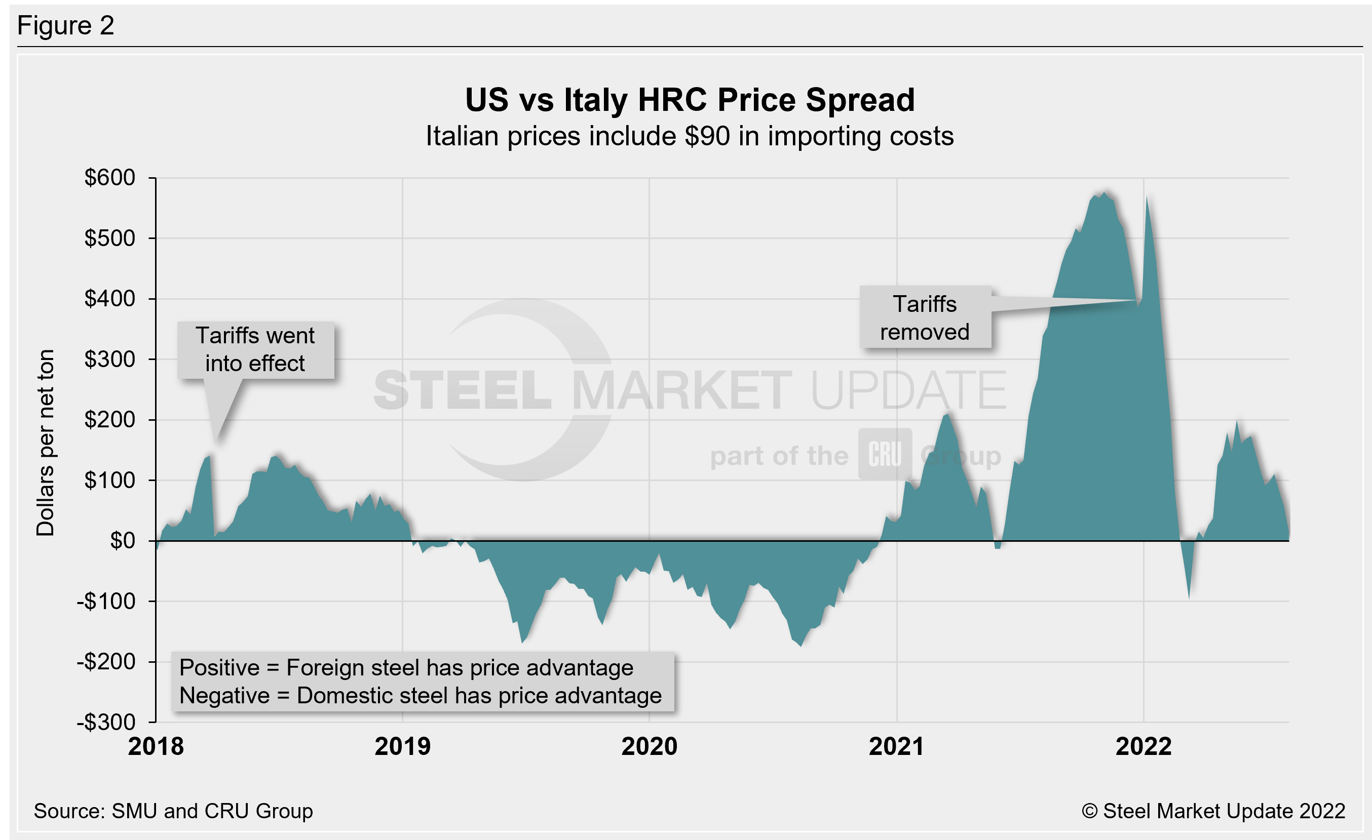 CRU published Italian HRC prices at $701 per net ton ($773 per metric ton), up $9 per ton from last week but down $65 per ton from one month ago. After adding import costs, the delivered price of Italian HRC is approximately $791 per ton. Accordingly, domestic HRC is now theoretically $14 per ton more expensive than imported Italian HRC, down from $58 per ton one week prior and down from $99 per ton four weeks ago. The highest spread this year was $200 per ton in mid-May. This is the 20th consecutive week foreign steel prices have held this price advantage. Prior to the removal of the 25% Section 232 tariff, the November 2021 spread of $577 per ton was the largest in SMU’s data history.
