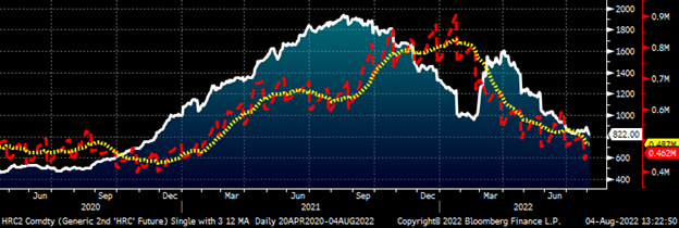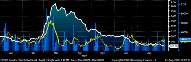 August CME Hot Rolled Coil Future $/st w Aggregate Curve Volume & 5-Day Avg.