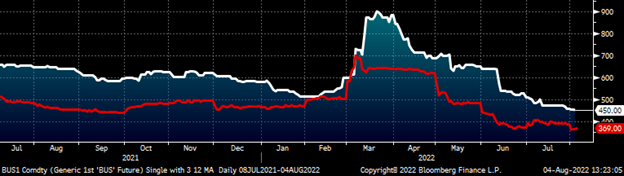 This chart shows the curve on July 15 (which was the most recent low), last Friday and today. So far this week, selling has come in targeting the front of the curve with the August and September futures falling to new lows, while the months after have held on to some of their gains. Buying in Q1 has remained steady in the face of the downside pressure on the front of the curve. The result has been a steepening of the curve with the January contract $80 above the September contract.