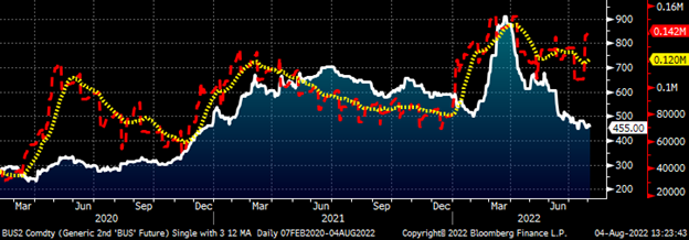 Open interest across the curve fell to 450,000 tons following July’s expiration last week. The red line below shows open interest with a 22-day moving average in yellow. Open interest is the number of outstanding futures contracts, or tons in this case.