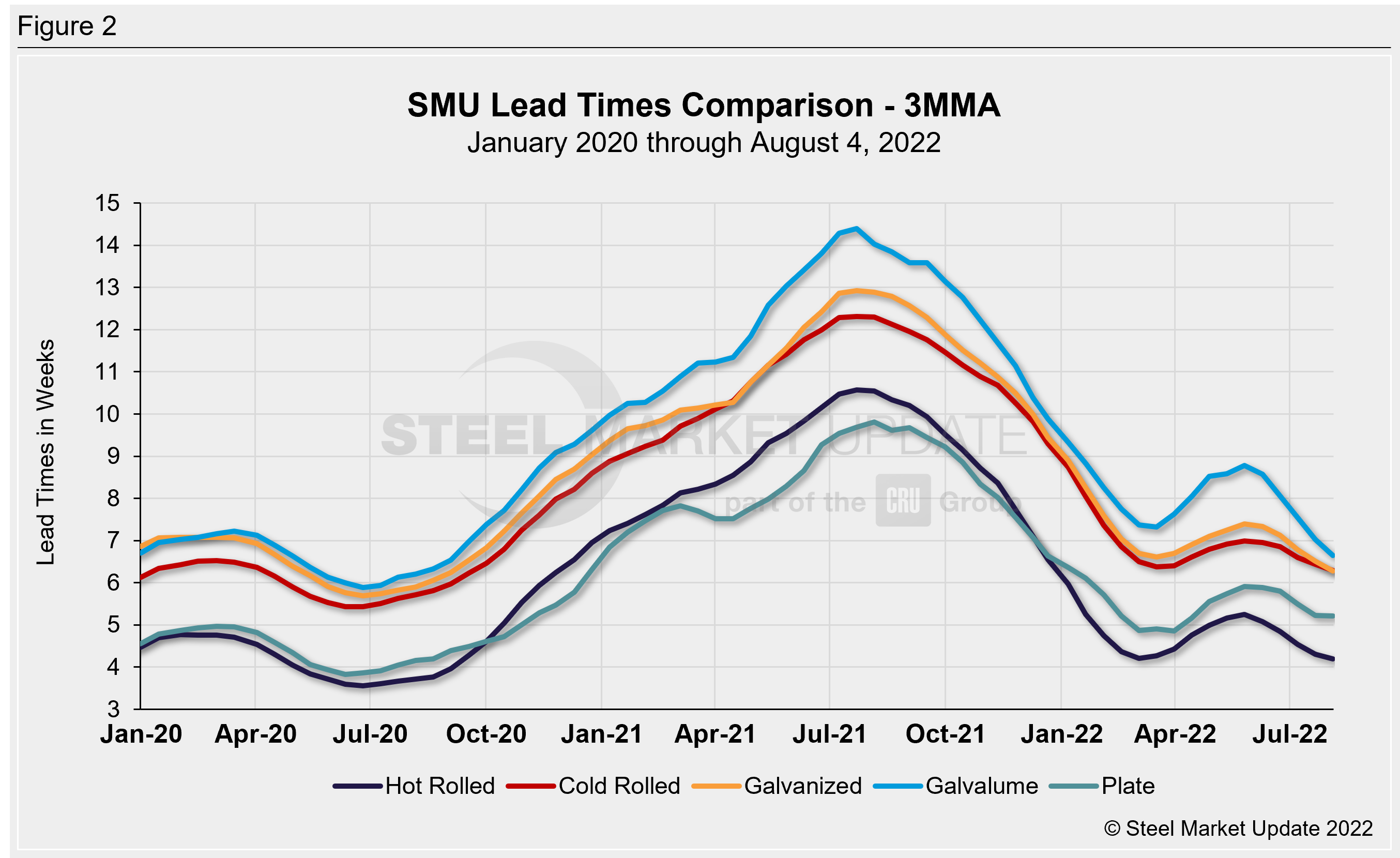 Looking at lead times on a three-month moving average can smooth out the variability in the biweekly readings. As a 3MMA, all products were flat to down 0.3 weeks compared to two weeks prior and down as much as 0.8 weeks compared to early July. The current 3MMA for hot rolled is down 0.1 weeks to 4.2 weeks, cold rolled eased 0.1 weeks to 6.3 weeks, galvanized is down 0.2 weeks to 6.3 weeks, Galvalume declined 0.3 weeks to 6.7 weeks, and plate was flat at 5.2 weeks.