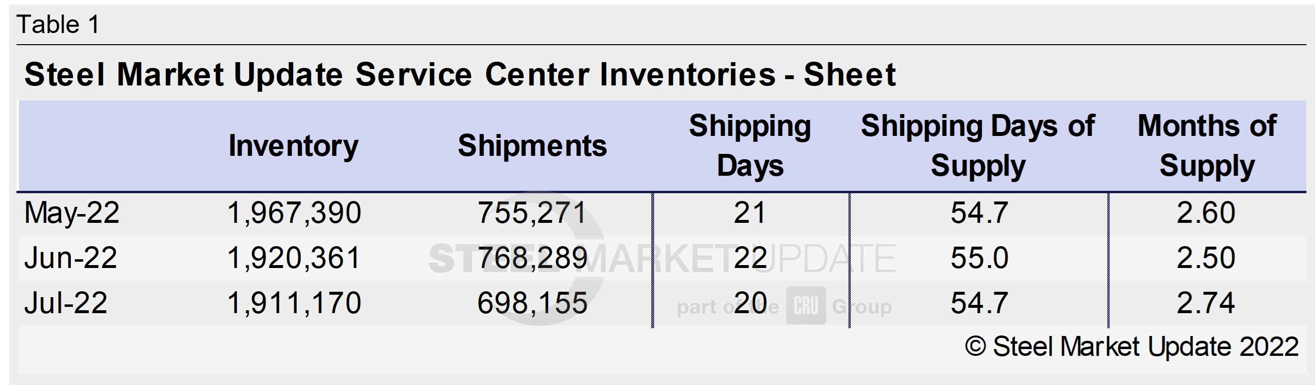 US service center flat rolled inventories declined slightly in July as service centers worked to align inventories with slowing demand. At the end of July, service centers carried 54.7 shipping days of supply, down from 55 shipping days in June on an adjusted basis. In terms of months on hand, sheet supply represented 2.74 months of supply, compared with 2.5 months of supply in June.