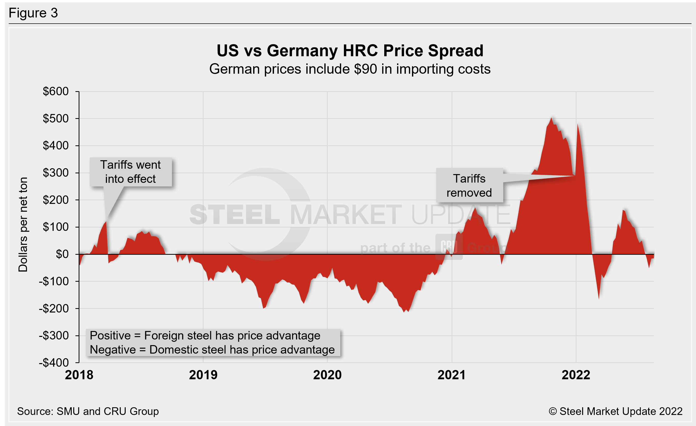The latest CRU German HRC price declined $21 per ton from last week to $725 per net ton ($800 per metric ton), down $46 per ton from one month ago. After adding import costs, the delivered price of German HRC is approximately $815 per ton. Accordingly, domestic HRC is now theoretically $15 per ton cheaper than imported German HRC, down from a spread of $16 per ton one week prior. Prior to the last week of June, German prices held the price advantage for 14 consecutive weeks; the spread was $14 per ton four weeks ago (meaning German imports were cheaper that domestic steel), and had reached a 2022 high of $164 in May. Prior to removal of the 25% tariff, the October 2021 spread of $504 per ton was the largest seen in SMU’s data history.