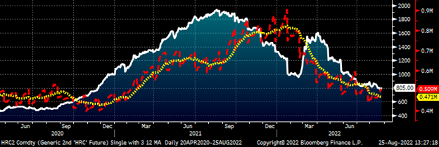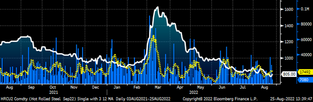Cliff’s price increase follows Nucor’s $50-per-ton increase announced on August 8. For some time, I have been flagging the upside risk in Midwest HRC due to a “sneaky tight” physical market and a potential build-up of new orders. On the futures front, the decline in open interest from a peak of 900k tons in January to about 510k tons as of yesterday implies a relatively low level of liquidity in the futures market, leaving it akin to a “dry forest floor.” If given a spark by perhaps a sudden surge of OEM forward buying, it could develop into another “squeeze” higher as was seen in March.