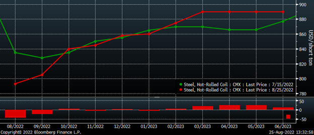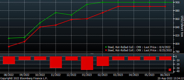 For a couple of weeks in late July, it appeared the futures curve had put in a bottom around July 15. But then the selling returned in earnest the week after Nucor’s $50/ton price increase announcement. Since July 15, the front months have declined, while the months of March ’23 forward have seen some gains. While none of the moves have been large, it has steepened the futures curve. But all-in-all, not much has actually happened over the past six weeks.