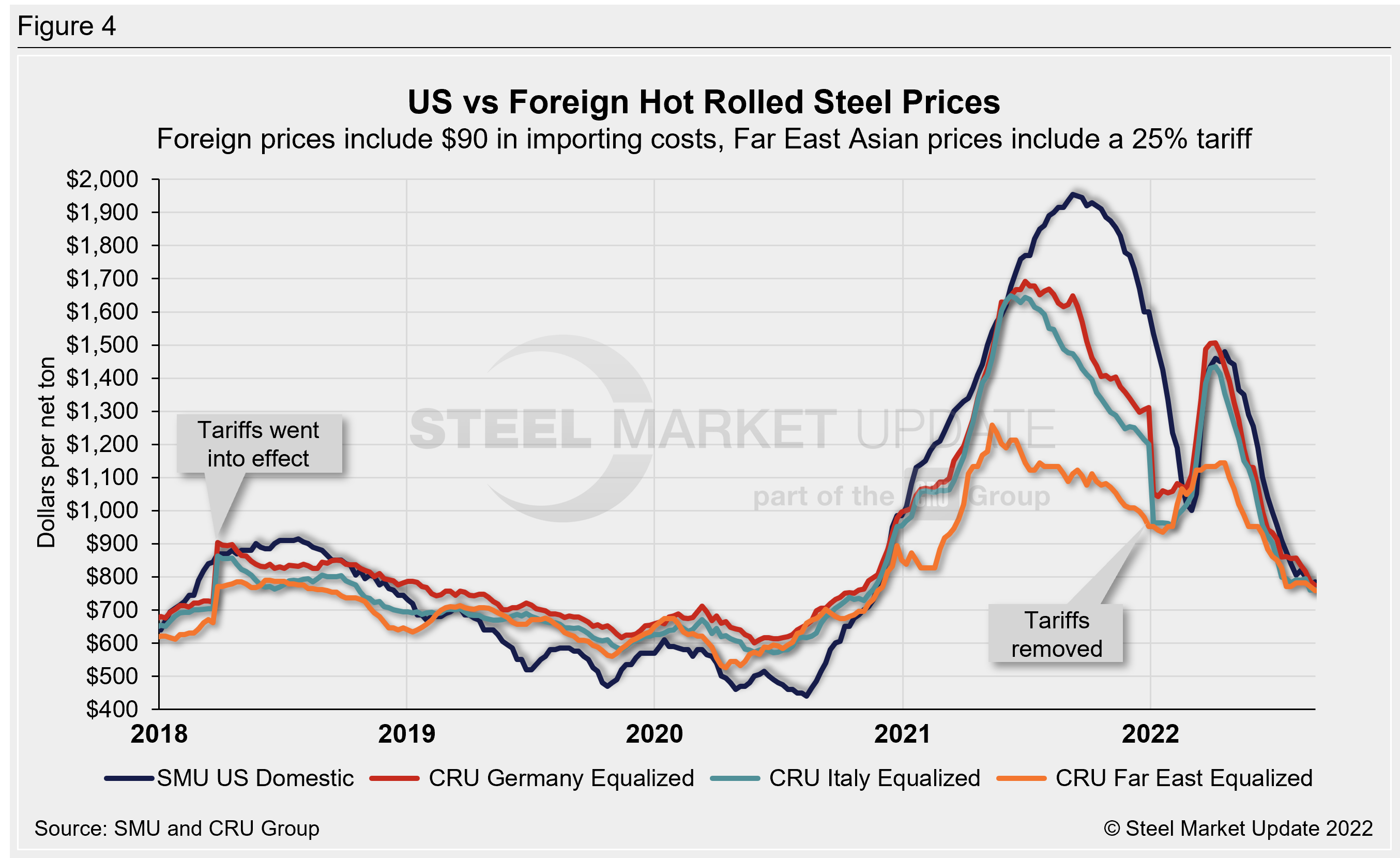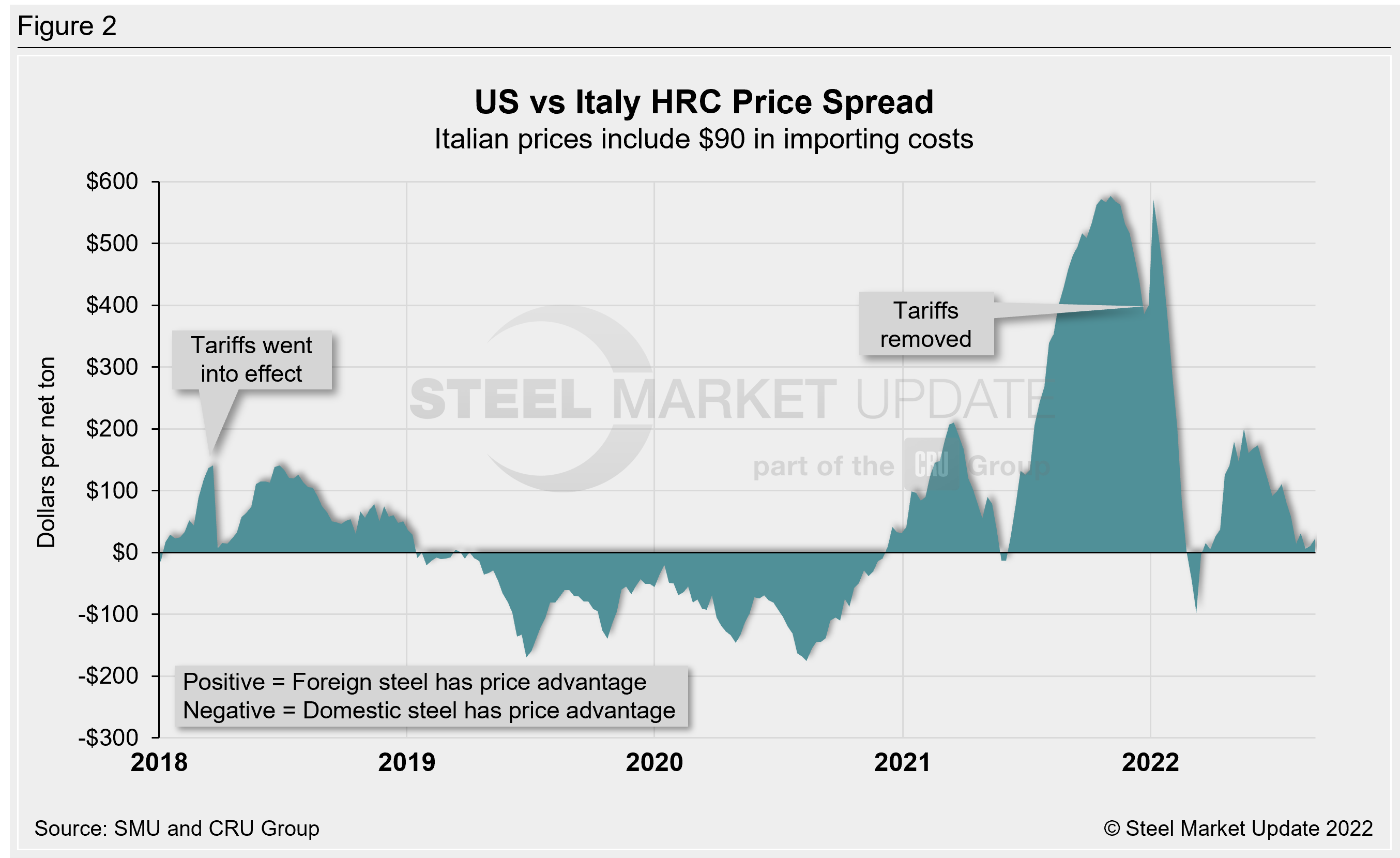 CRU published Italian HRC prices at $672 per net ton ($741 per metric ton), up $2 per ton from last week, but down $29 per ton compared to one month ago. After adding import costs, the delivered price of Italian HRC is approximately $762 per ton. Accordingly, domestic HRC is now theoretically $23 per ton more expensive than imported Italian HRC. This is up from a spread of $10 per ton one week earlier and up from $14 per ton four weeks ago. The highest spread this year was $200 per ton in May. Italian hot-rolled has held this price advantage for the past five months. Prior to the removal of the 25% Section 232 tariff, the November 2021 spread of $577 per ton was the largest in SMU’s data history.