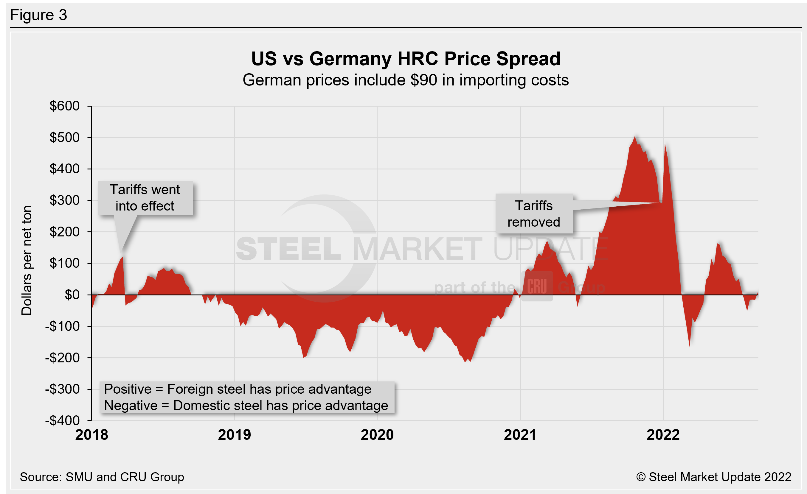 The latest CRU German HRC price declined $12 per ton from last week to $684 per net ton ($754 per metric ton), down $83 per ton from one month ago. After adding import costs, the delivered price of German HRC is approximately $774 per ton. Accordingly, domestic HRC is now theoretically $11 per ton more expensive than imported German HRC. The five prior weeks saw the opposite situation; domestic prices were $16 per ton cheaper than imported German steel last week and $52 per ton cheaper one month ago. Prior to late June, German prices held the price advantage for 14 consecutive weeks and had reached a 2022 high of $164 in May. Prior to the removal of the 25% tariff, the October 2021 spread of $504 per ton was the largest seen in SMU’s data history.