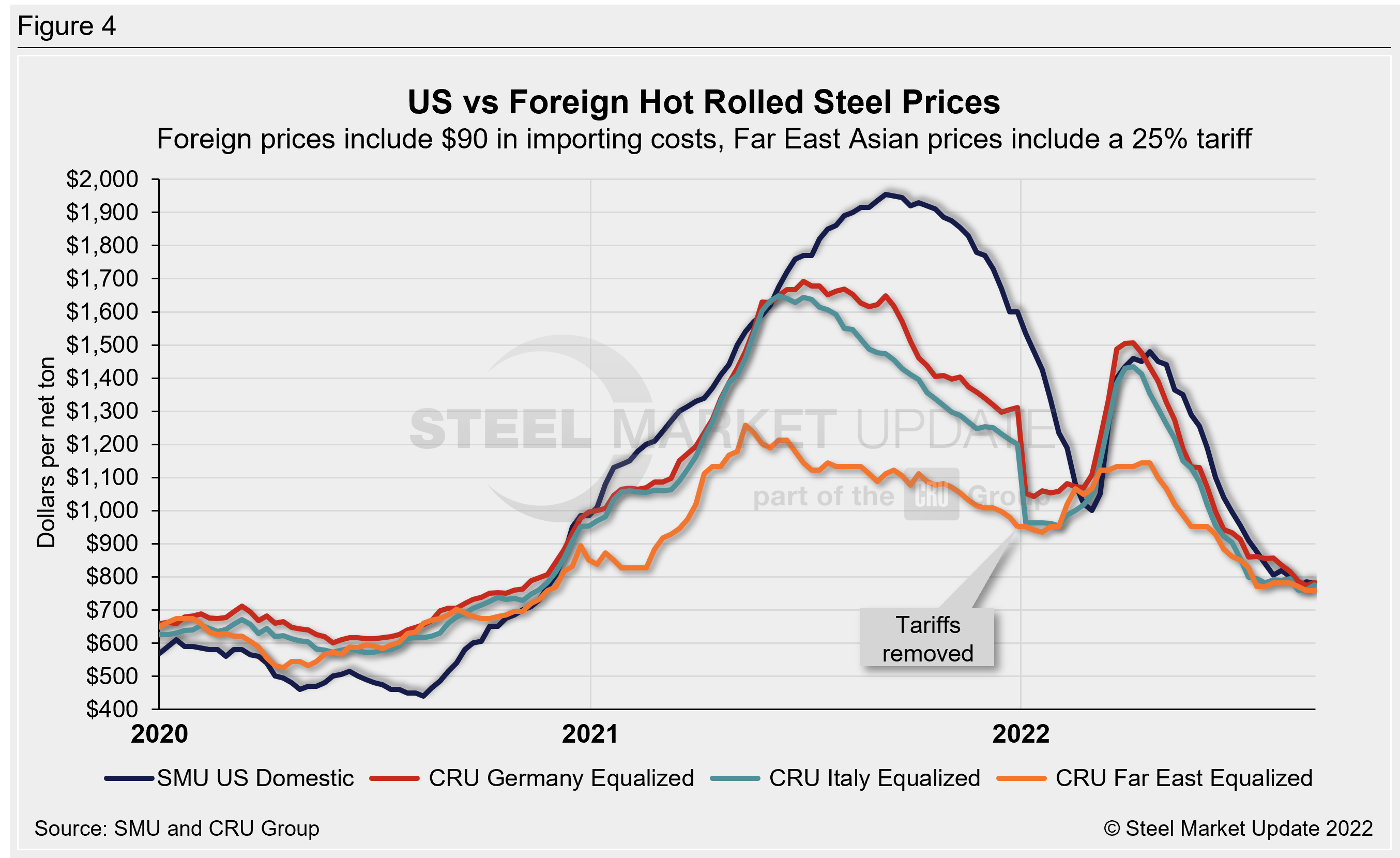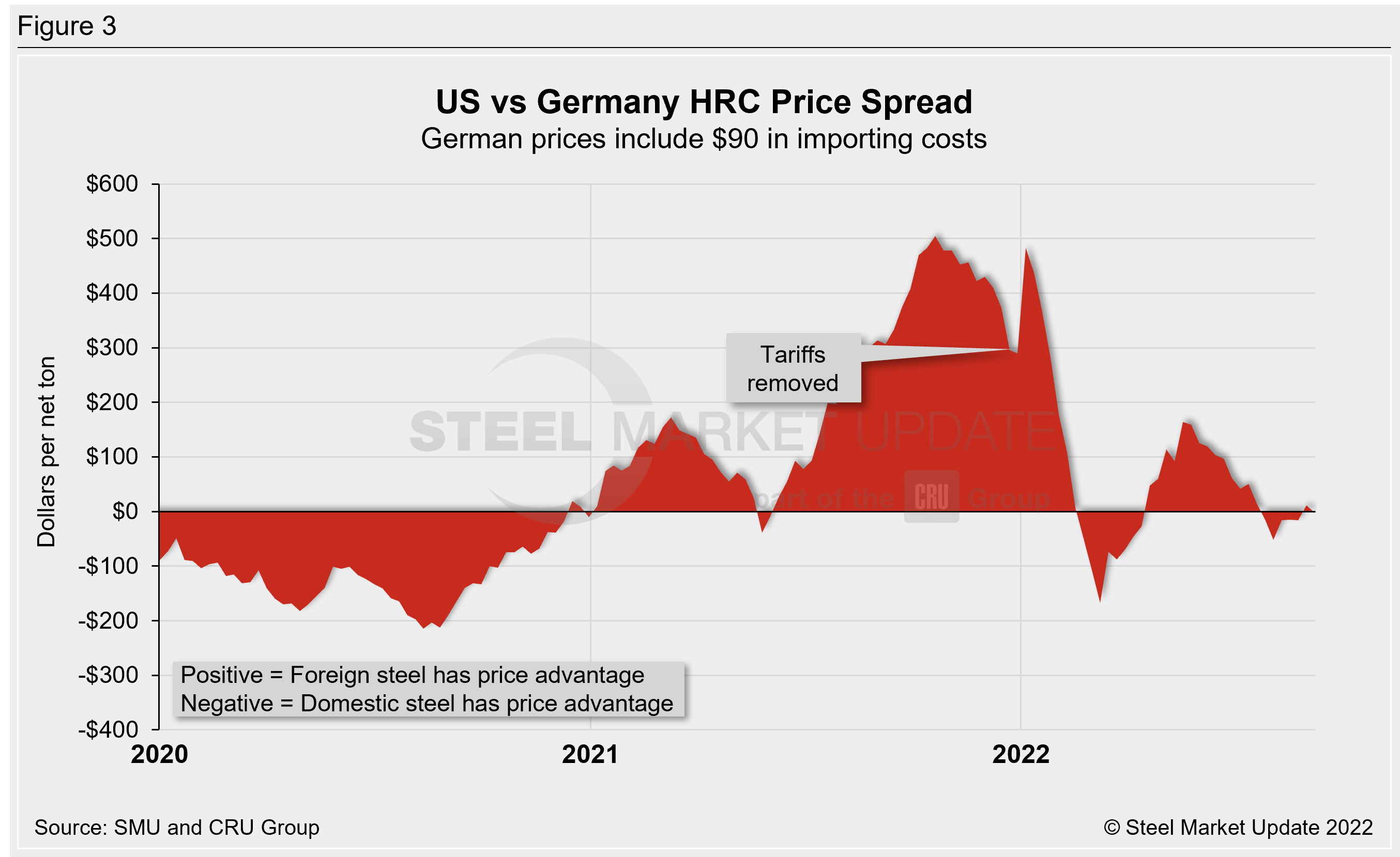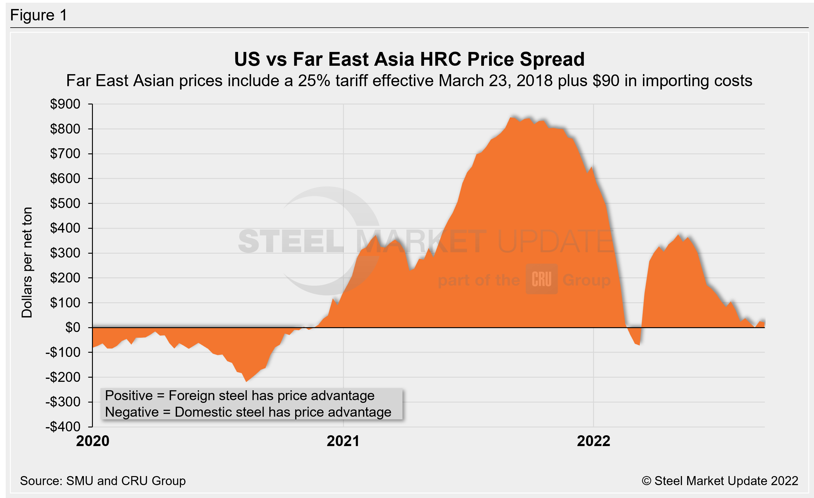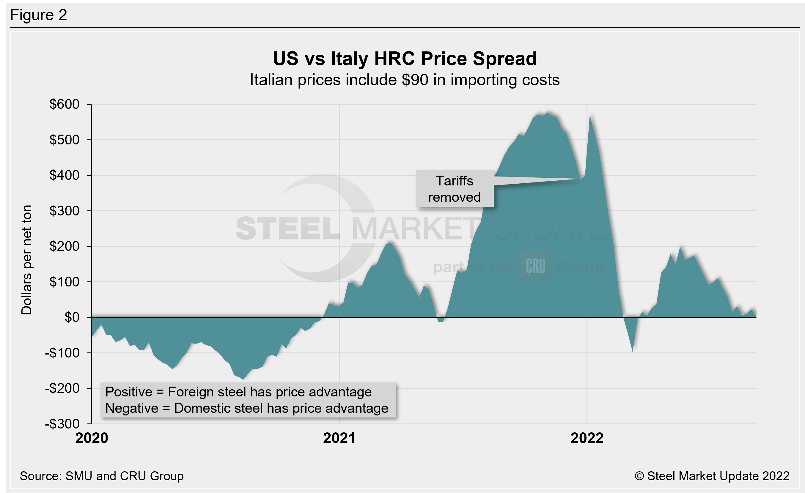 CRU published Italian HRC prices at $686 per net ton ($756 per metric ton), up $14 per ton from last week, but down $13 per ton compared to one month ago. After adding import costs, the delivered price of Italian HRC is approximately $776 per ton. Accordingly, domestic HRC is now theoretically just $4 per ton more expensive than imported Italian HRC. That’s the lowest the spread has been since March. This is down from a spread of $23 per ton one week earlier and down from $31 per ton four weeks ago. The highest spread this year was $200 per ton in May. Italian hot-rolled has held this price advantage for more than five months. Before the removal of the 25% Section 232 tariff, the November 2021 spread of $577 per ton was the largest in SMU’s data history.