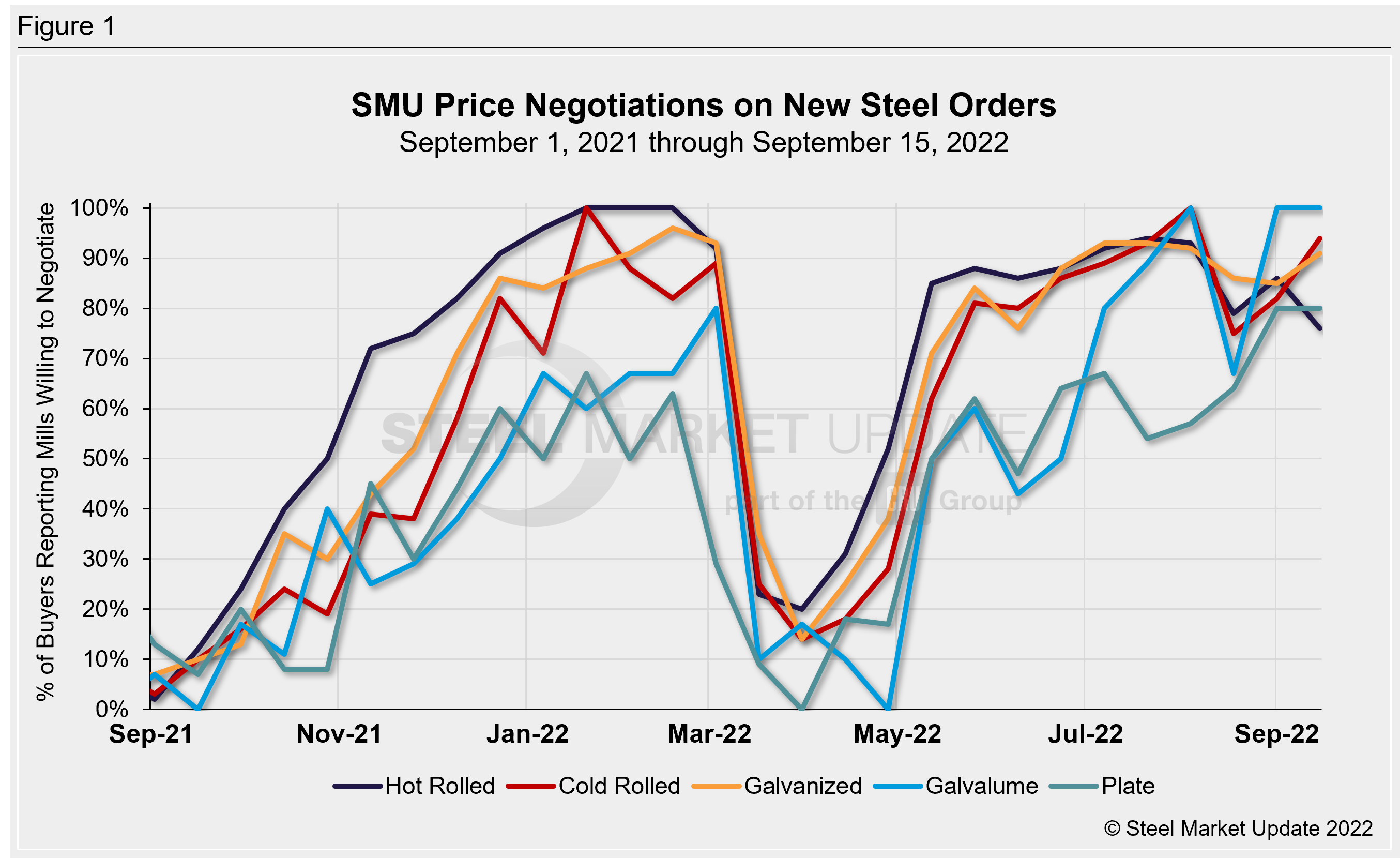 Galvalume negotiation rates tend to be more volatile due to the smaller market size, with 100% of respondents reporting mills are negotiable this week, unchanged from two weeks ago and up from a 67% rate in mid-August.