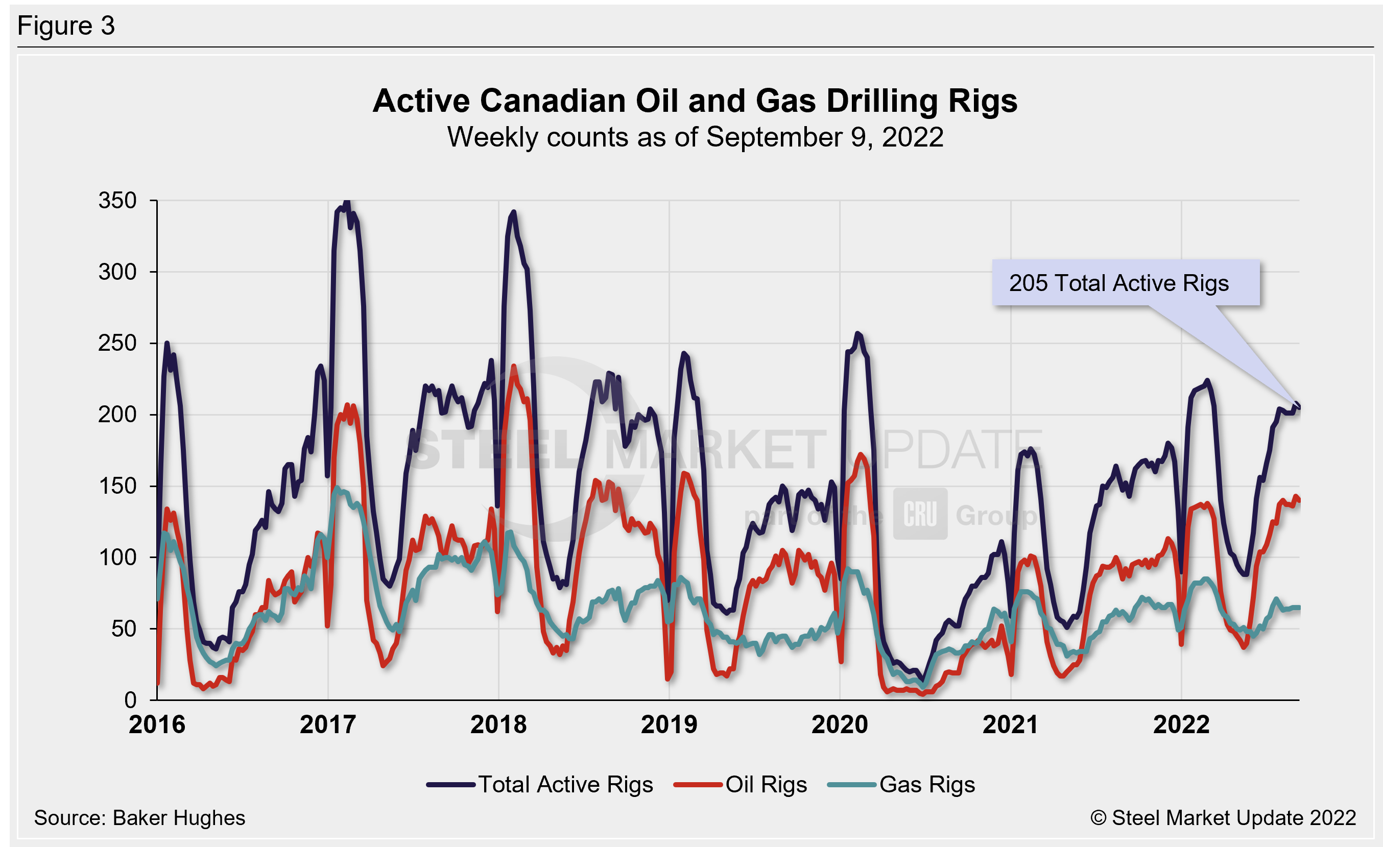 The latest Canadian rig count climbed to 205 rigs, comprised of 140 oil rigs and 65 gas rigs. Canadian rig counts are up 43% compared to one year prior, but down 16% from pre-Covid levels (Figure 3).