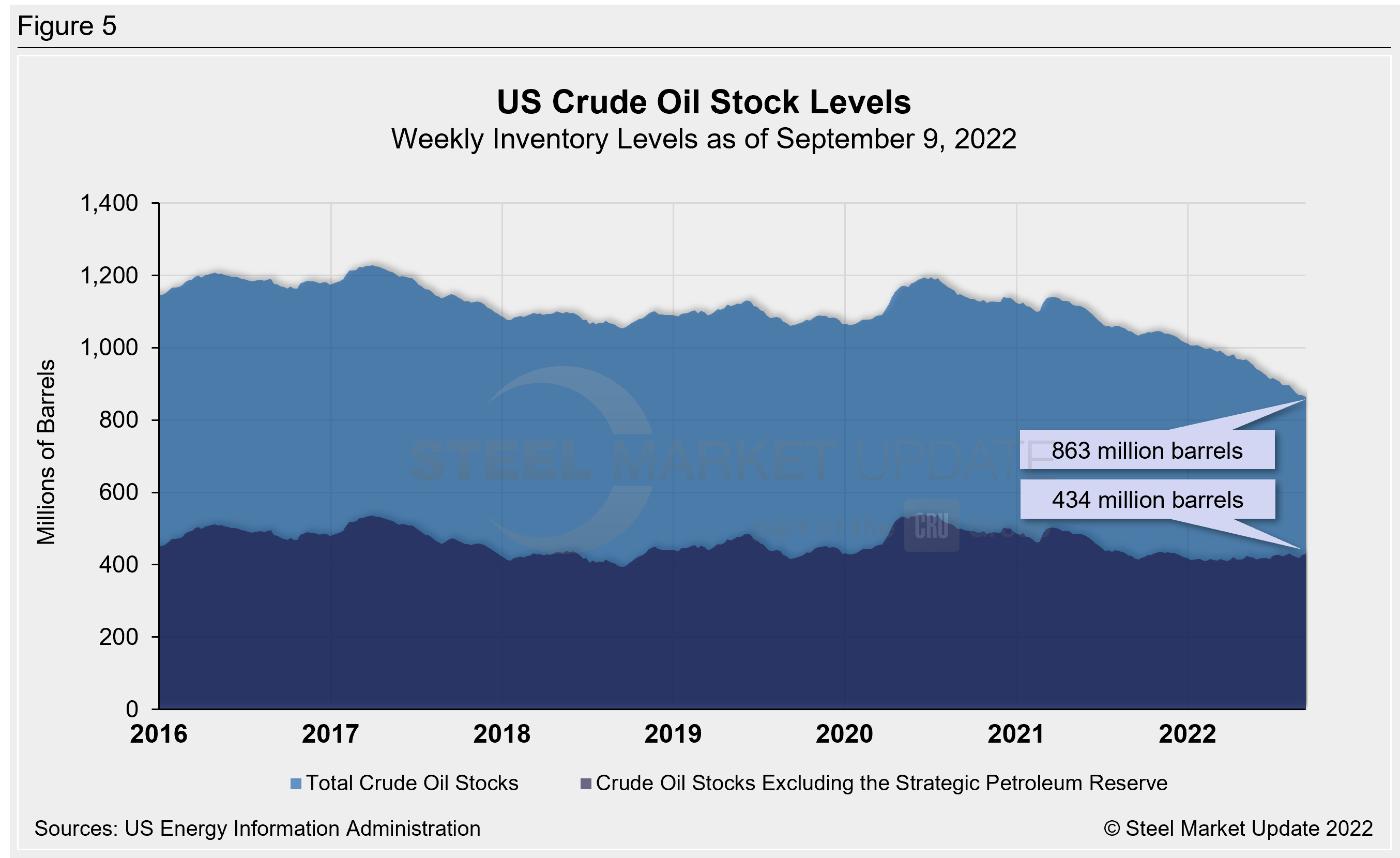 US total crude oil stocks continue to decline from mid-2020 highs, falling to a 19-year low of 863 million barrels as of Sept. 9. For comparison, the record low in the EIA’s 40-year history was 608 million barrels in October 1982. Last week’s stock level is down 17% from 1.038 billion barrels one year ago (Figure 5).