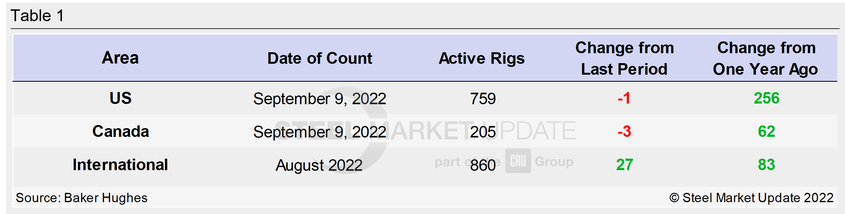Table 1 below compares the current US, Canadian and international rig counts to historical levels.