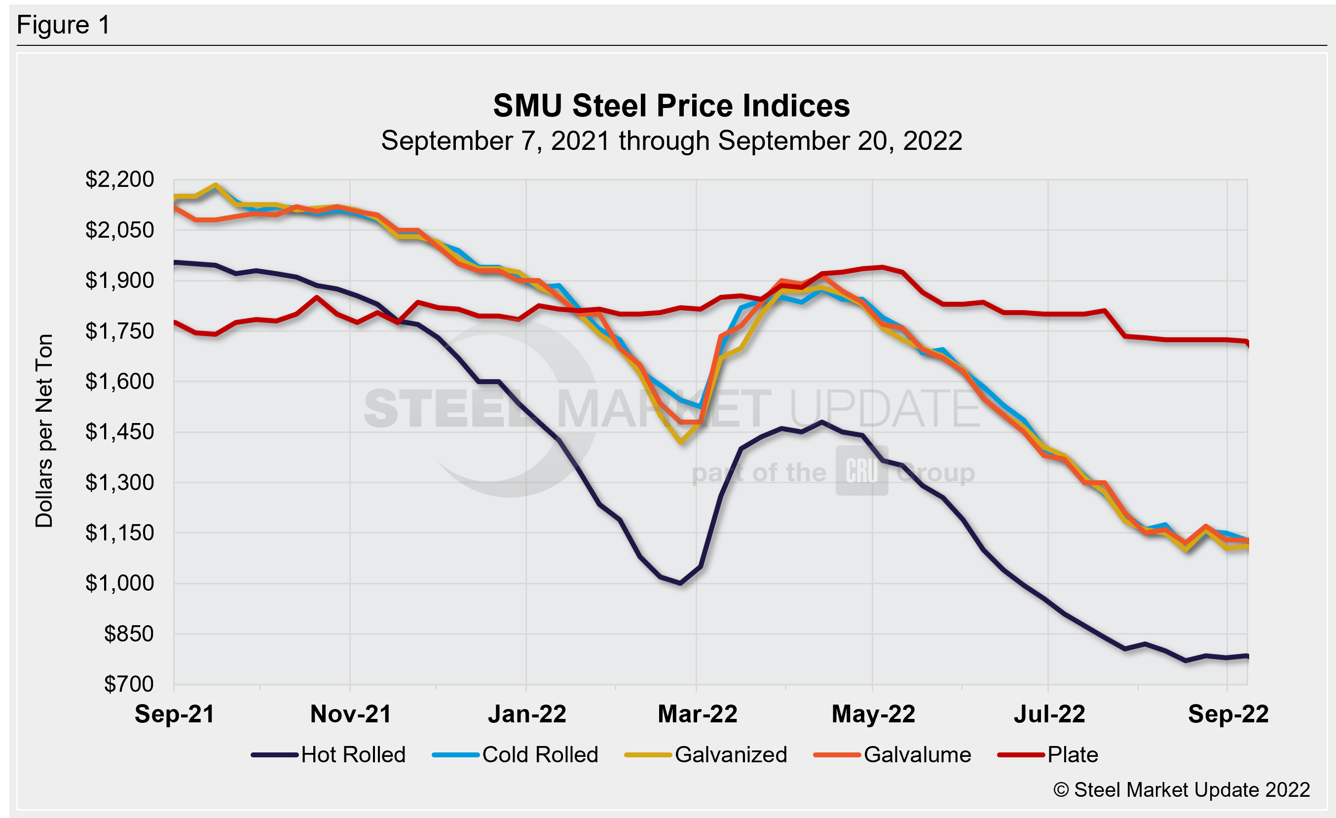 SMU’s hot-rolled index eased an average of $15 per net ton this week to $770 per ton. This is now tied with our late August price for the lowest HRC price seen since November 2020. Cold-rolled prices declined $10 per ton on average, while coated products fell more significantly week-over-week, as much as $25 per ton. Market participants attribute declining prices to short lead times, weakening demand, and healthy inventories—commenting they see little pressure to buy at this time.