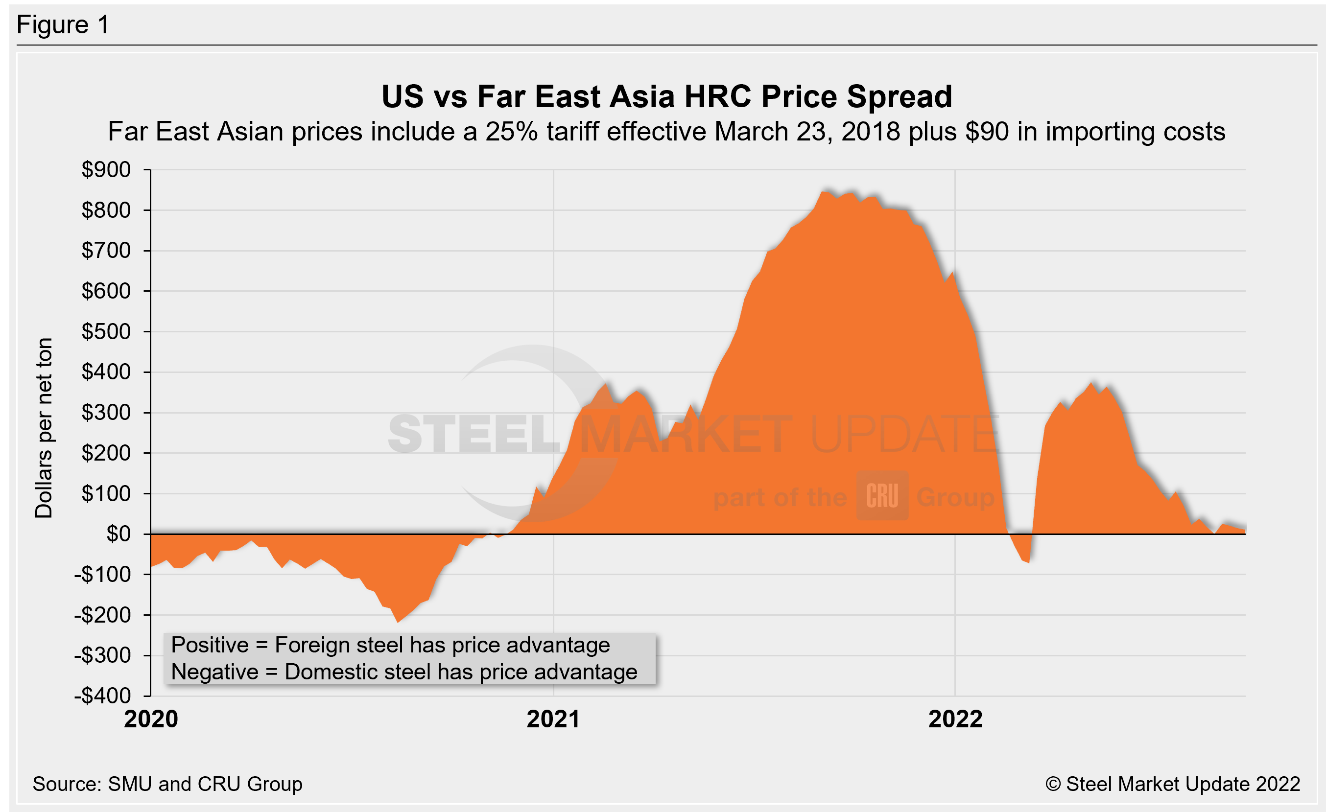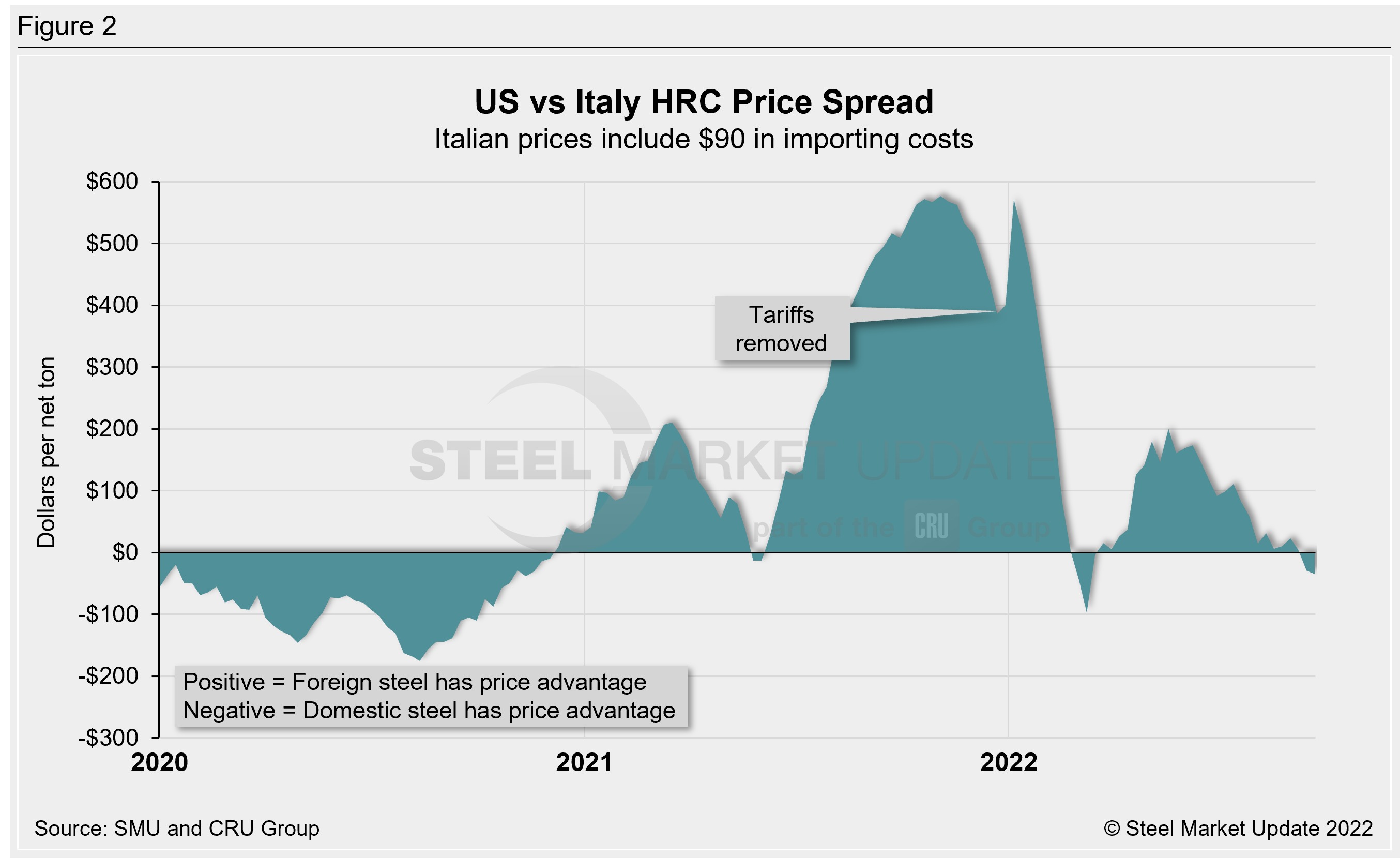 CRU published Italian HRC prices at $715 per net ton ($788 per metric ton), down $9 per ton from last week, but up $45 per ton compared to one month ago. After adding import costs, the delivered price of Italian HRC is approximately $805 per ton. Accordingly, domestic HRC is now theoretically $35 per ton cheaper than imported Italian HRC. Last week this spread was $29 per ton — that was the first time domestic prices held an advantage over Italian HRC since early March. We saw the opposite situation two weeks earlier when foreign prices held a $4 per ton discount to domestic steel, as well as one month ago when the spread was $10 per ton. The highest spread this year was $200 per ton in May. Prior to this week, Italian hot-rolled had held the price advantage for over five months. Before the removal of the 25% Section 232 tariff, the November 2021 spread of $577 per ton was the largest in SMU’s data history.