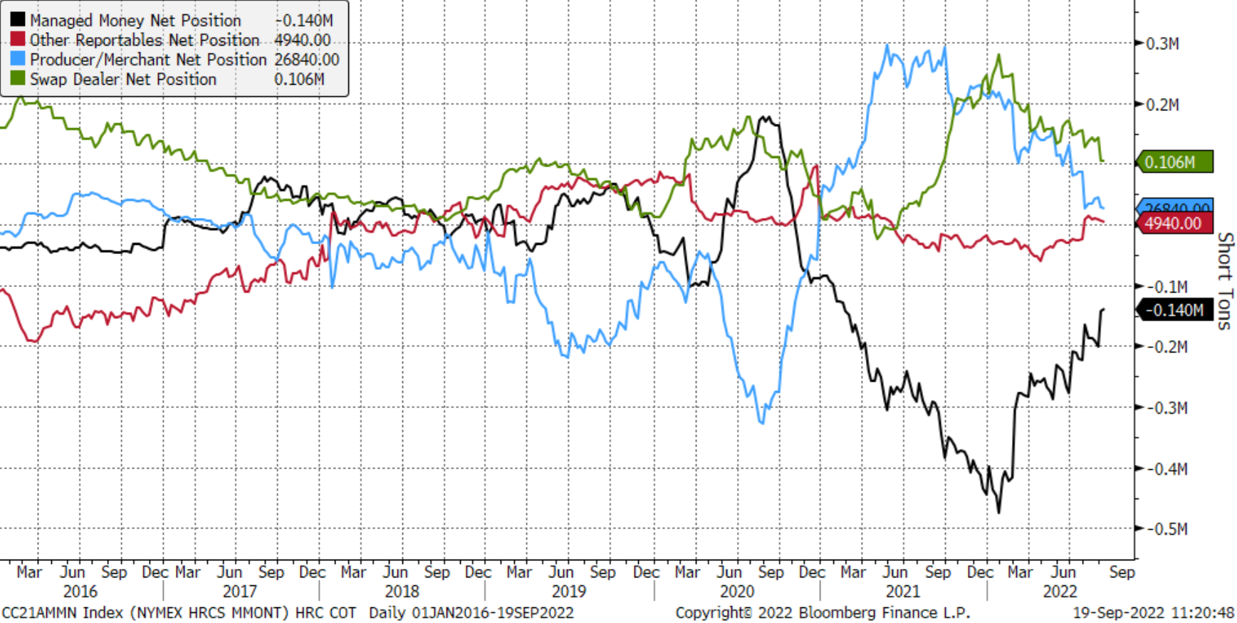 When looking for balance to the bearish narrative circulating in the market, we often look to the commitment of trader’s report. Those of us who trade the HRC contract have referenced this before in articles. A quick refresher: it captures the positions of those trading the contract and gives an objective look at how the different market participants are positioned.