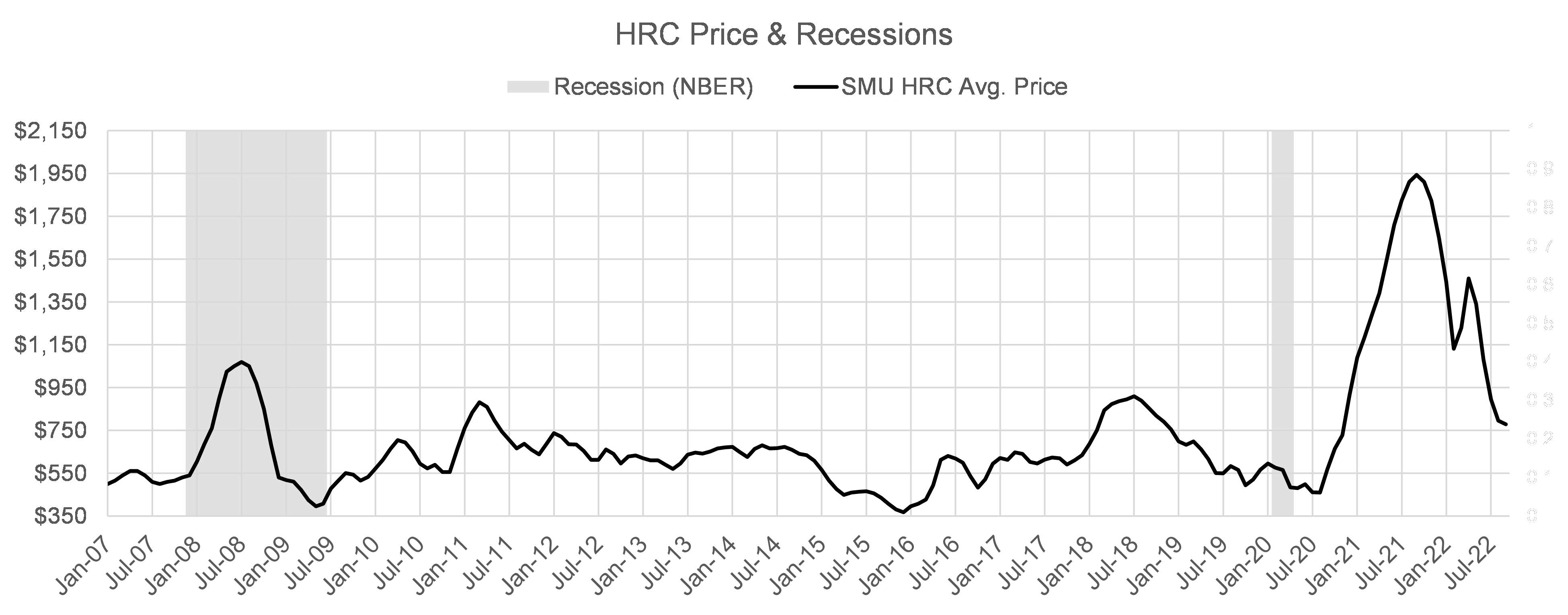 To be fair, the above comments about previous market behavior and them providing a clue toward future outcomes is tricky. Little of what we have endured over the last 2-3 years is rational or fundamental. With a hawkish Fed and recession fears raging, perhaps the last three years of trading history is not as much precedent as it is excrement. The chart below shows how HRC prices have fared during the last two recessions. 2008 was interesting in that we saw strong gains in HRC during the first part of the Great Recession. But we were also amid the Chinese-led commodity super cycle, which is not the case today. In both cases we exited those recessions with HRC prices lower than where we entered. If another recession is looming, then one must wonder how much lower HRC could go as a result.