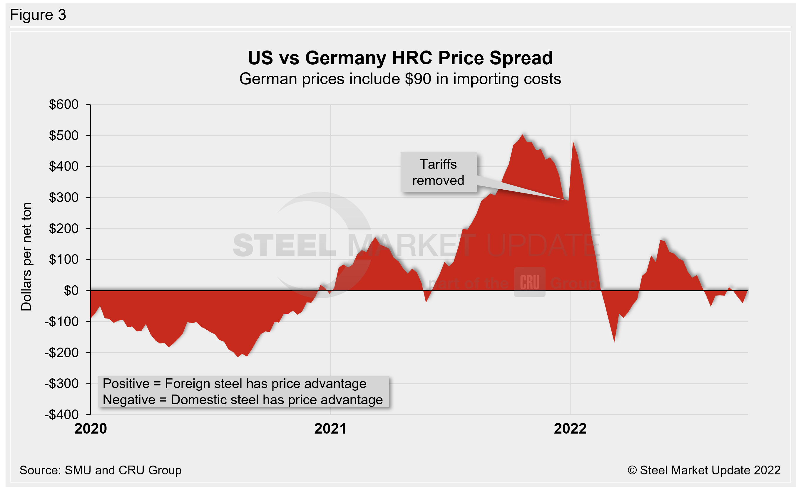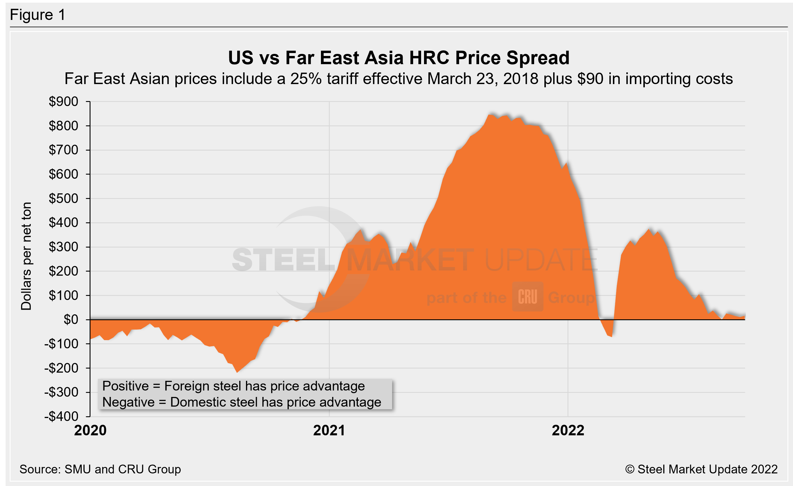 The following calculation is used by SMU to identify the theoretical spread between foreign HRC prices (delivered to US ports) and domestic HRC prices (FOB domestic mills). Our analysis compares the SMU US HRC weekly index to the CRU HRC weekly indices for Germany, Italy, and Far East Asian ports. This is only a theoretical calculation as costs to import can vary greatly and often fluctuate, ultimately influencing the true market spread.