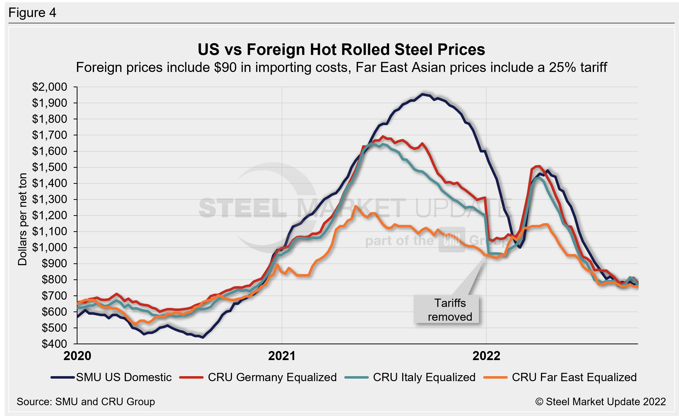Note that effective Jan. 1, 2022, the traditional Section 232 tariff no longer applies to most imports from the European Union. It has been replaced by a tariff rate quota (TRQ). Therefore, the German and Italian price comparisons in this analysis no longer include a 25% tariff. SMU still includes the 25% S232 tariff on foreign prices from other countries. We do not include any antidumping (AD) or countervailing duties (CVD) in this analysis.