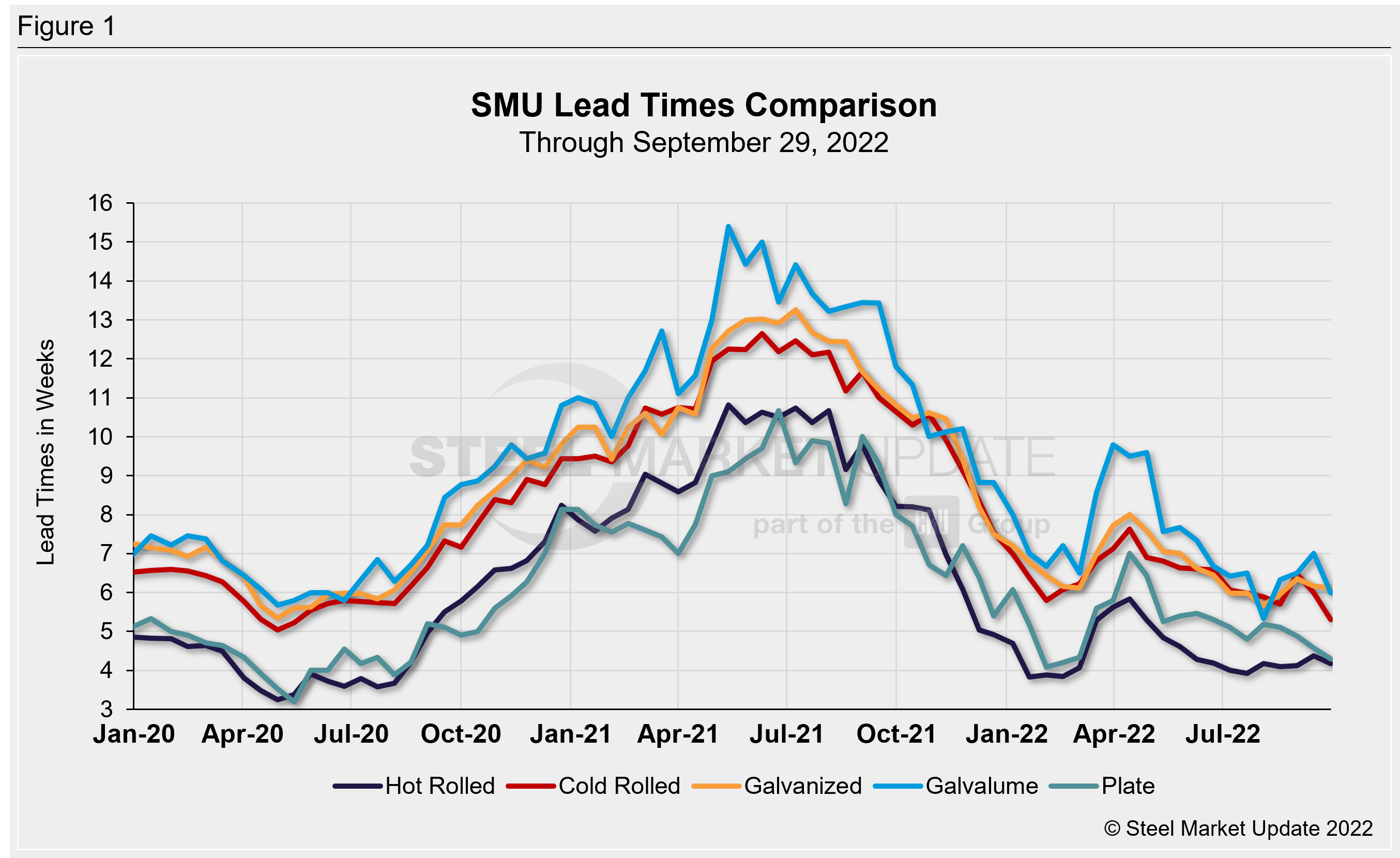 Steel mill lead times shrunk across the board this week, with the processing time narrowing for all five products we track. SMU’s latest lead times analysis shows that production times on hot rolled, galvanized, and plate products declined 0.1–0.3 weeks compared to our previous check on the market, while cold rolled and Galvalume lead times fell between 0.7–1.0 weeks.