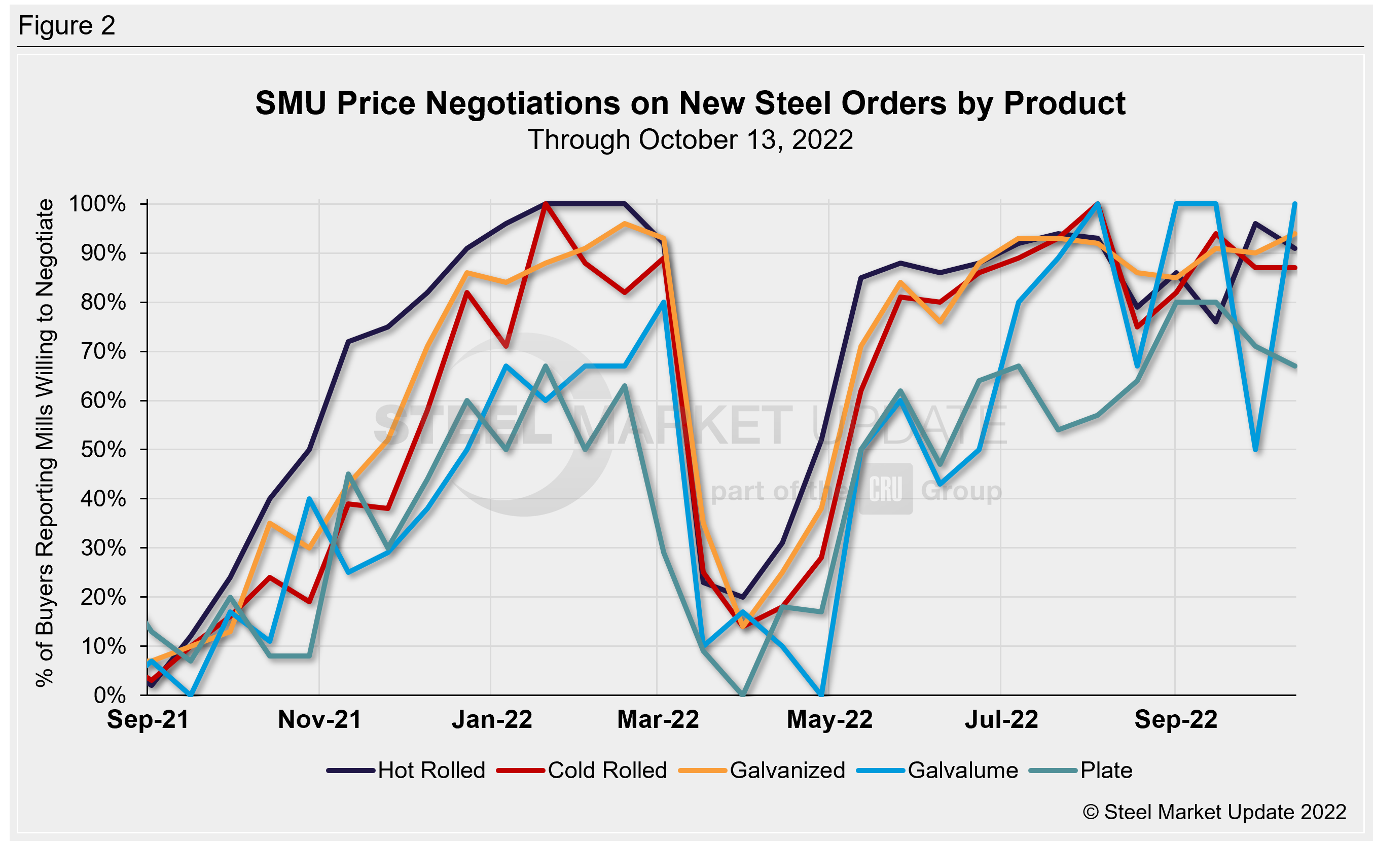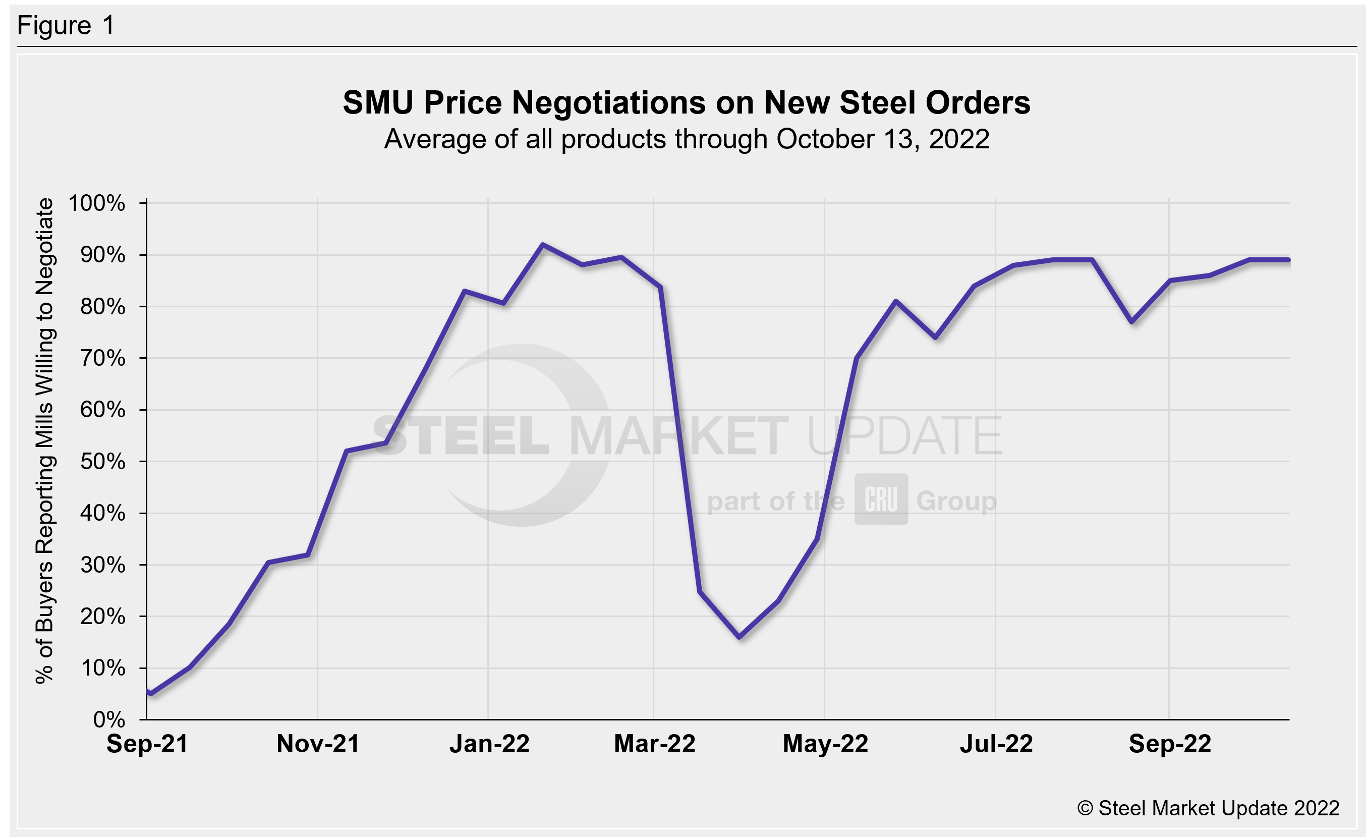 Steel Market Update polls hundreds of steel buyers every week, asking this question: Do you find domestic mills willing to negotiate spot pricing on new orders? On average this week, 89% of steel buyers reported that mills were willing to negotiate lower prices on new orders. As shown in Figure 1, this negotiation rate is in line with what we reported in late September. It remains near the previous high levels seen in July and early August. Recall we saw negotiation rates as low as 16% in March.