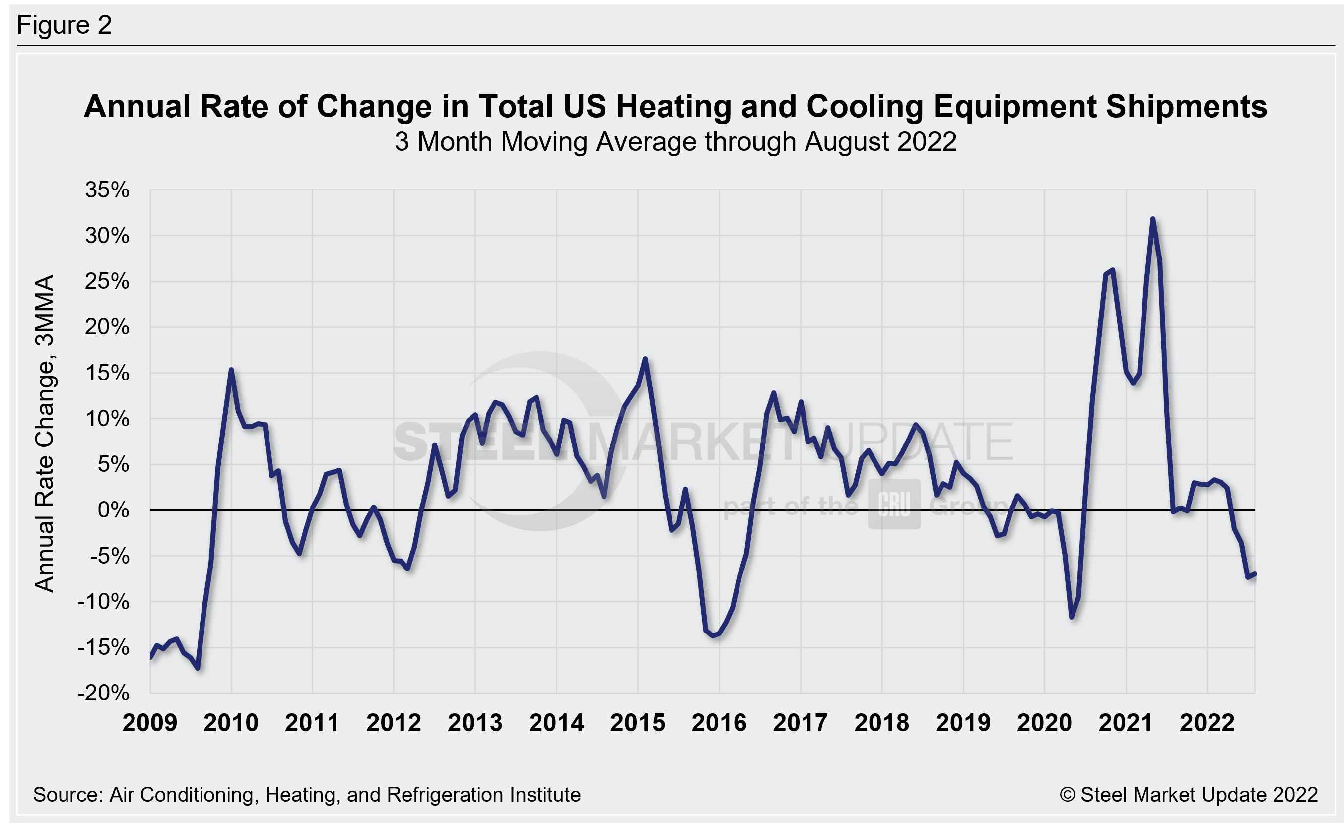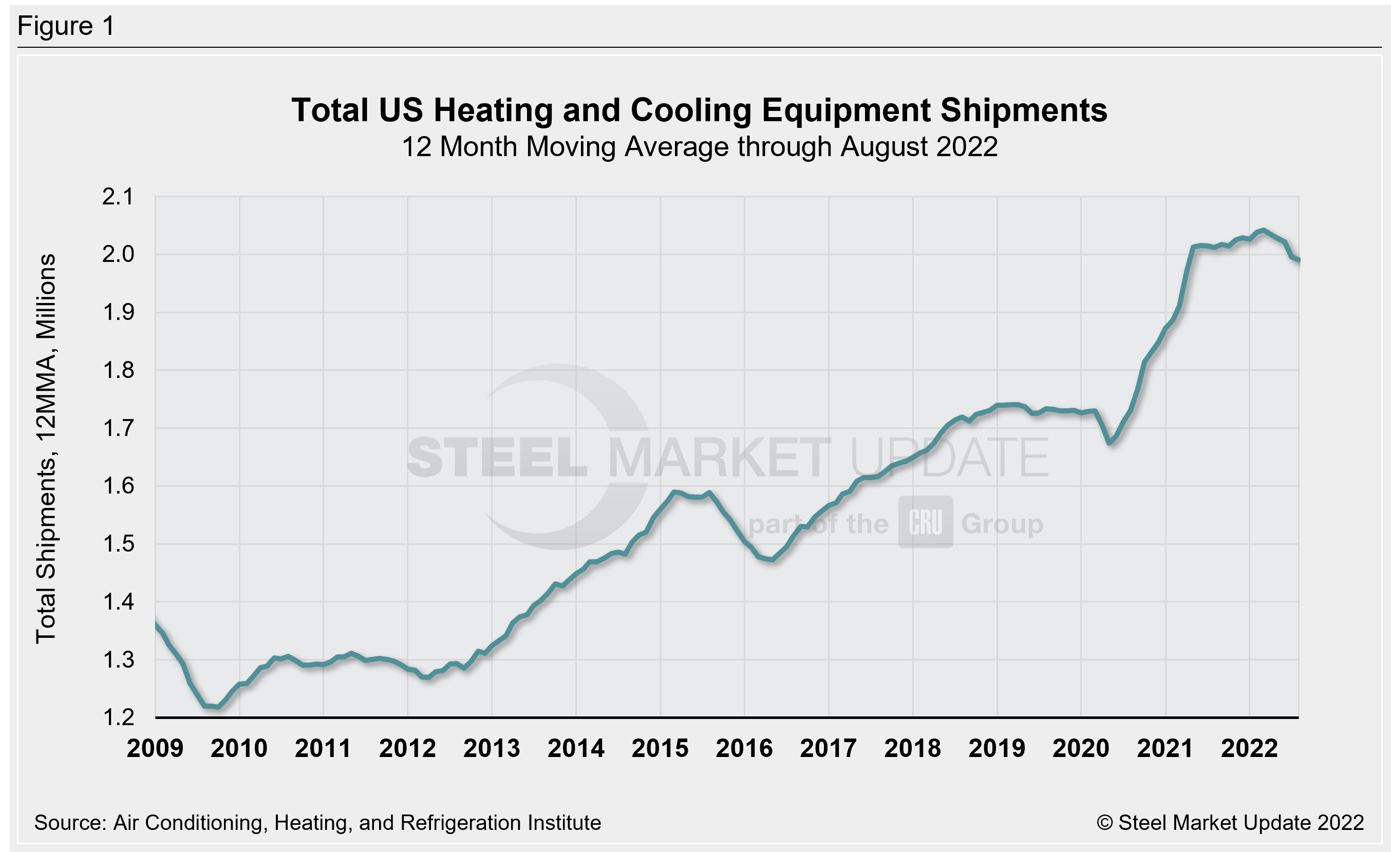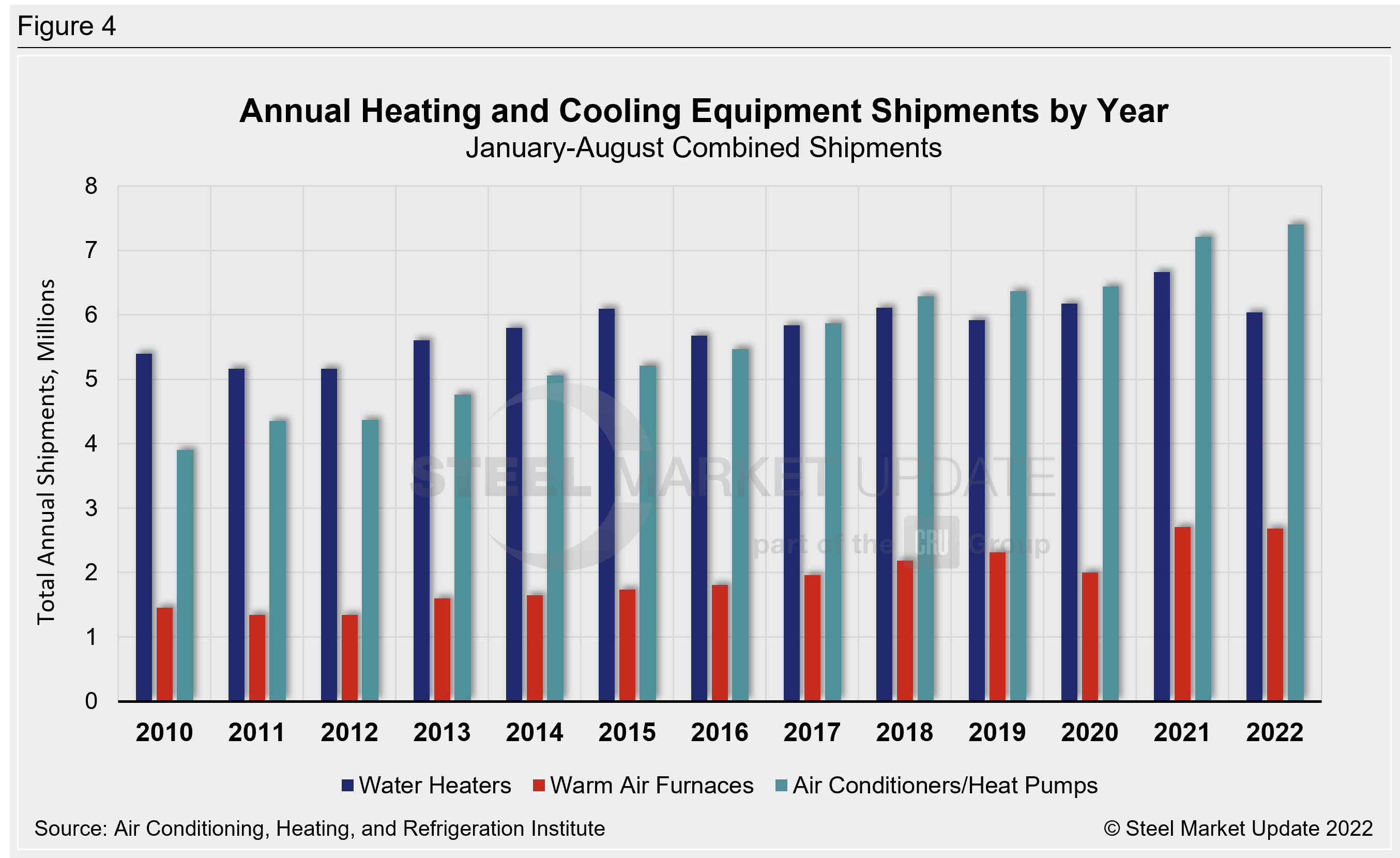 An interactive history of heating and cooling equipment shipment data is available on our website. If you need assistance logging in to or navigating the website, please contact us at Info@SteelMarketUpdate.com.