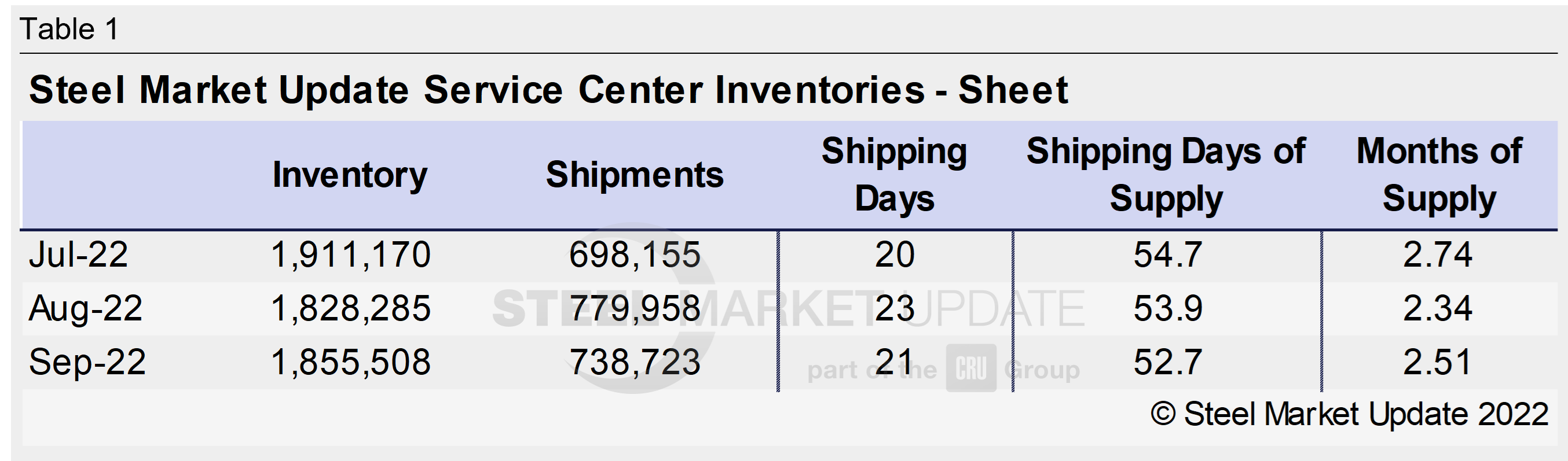 US service center flat rolled supply on hand edged down in September, reflecting a higher daily shipment rate. At the end of September, service centers carried 52.7 shipping days of supply of flat rolled, down from 53.9 shipping days of supply in August. In terms of months of supply, service centers carried 2.51 months of supply in September, up from 2.34 months in August.