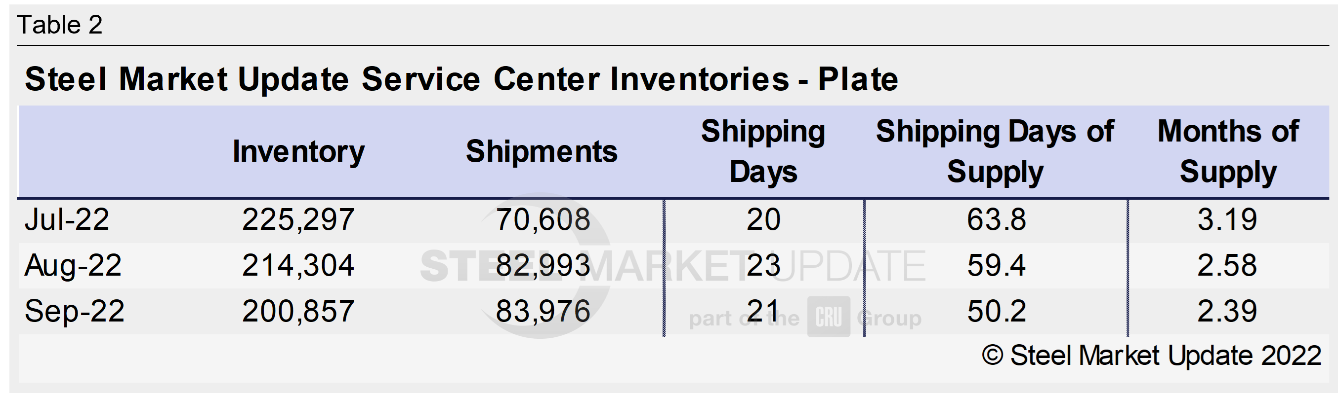 US service center plate inventories fell significantly in September with higher shipments. At the end of September, service centers carried 50.2 shipping days of supply, down from 59.4 shipping days in August. Plate inventories represented 2.39 months of supply in September, down from 2.58 months in August.