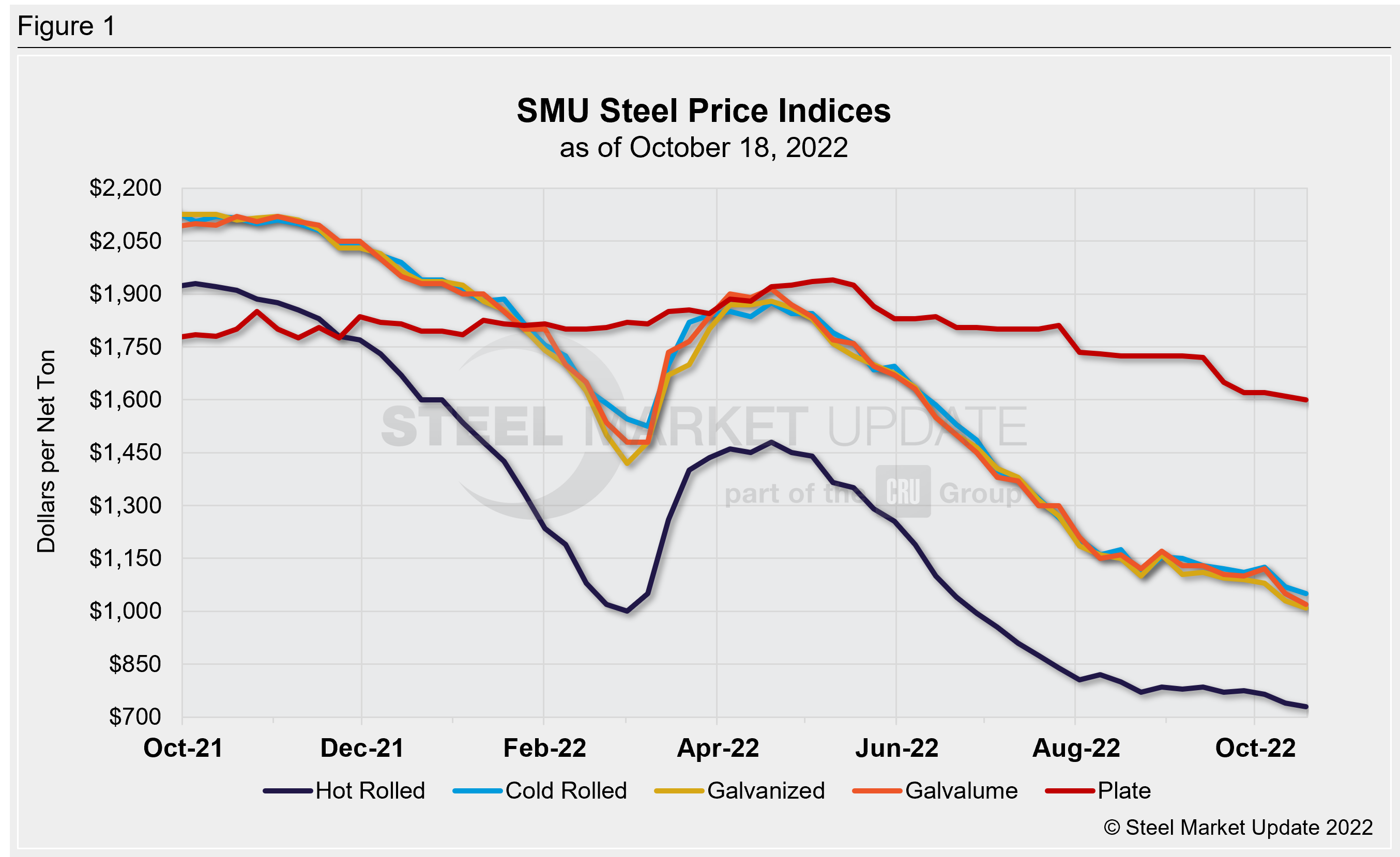 Steel prices trended lower again this week, the second consecutive week of moderate declines, according to Steel Market Update sources. Sheet prices declined between $10–30 per net ton compared to last week, now at levels not seen since late 2020. Plate prices were broadly unchanged from last week, but are slowly easing towards levels last seen 15 months ago. These declines follow nearly two months of mostly sideways or modestly down prices.