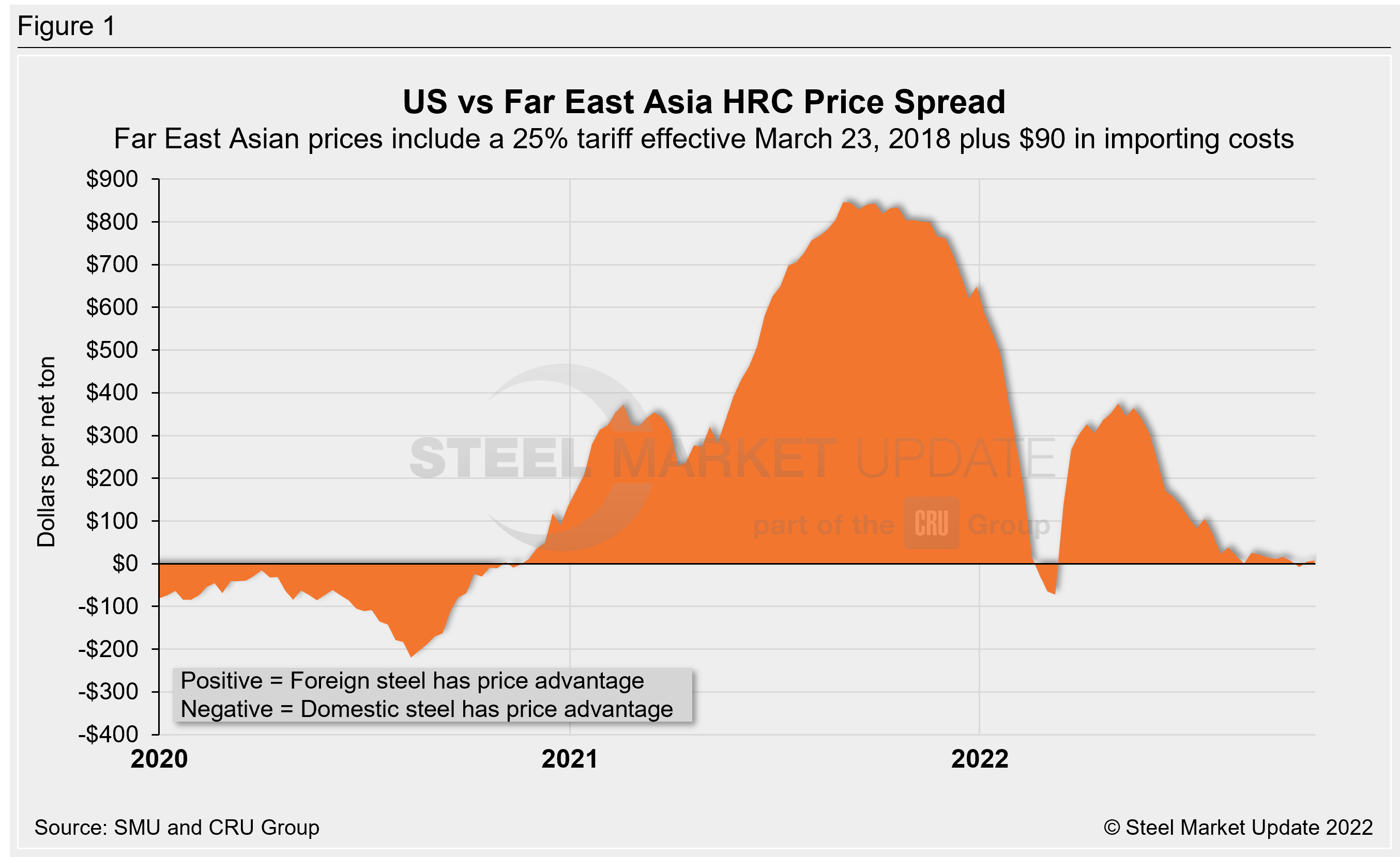 SMU uses the following calculation to identify the theoretical spread between foreign HRC prices (delivered to US ports) and domestic HRC prices (FOB domestic mills). Our analysis compares the SMU US HRC weekly index to the CRU HRC weekly indices for Germany, Italy, and Far East Asian ports. This is only a theoretical calculation because costs to import can vary greatly and often fluctuate, which influences the true market spread.