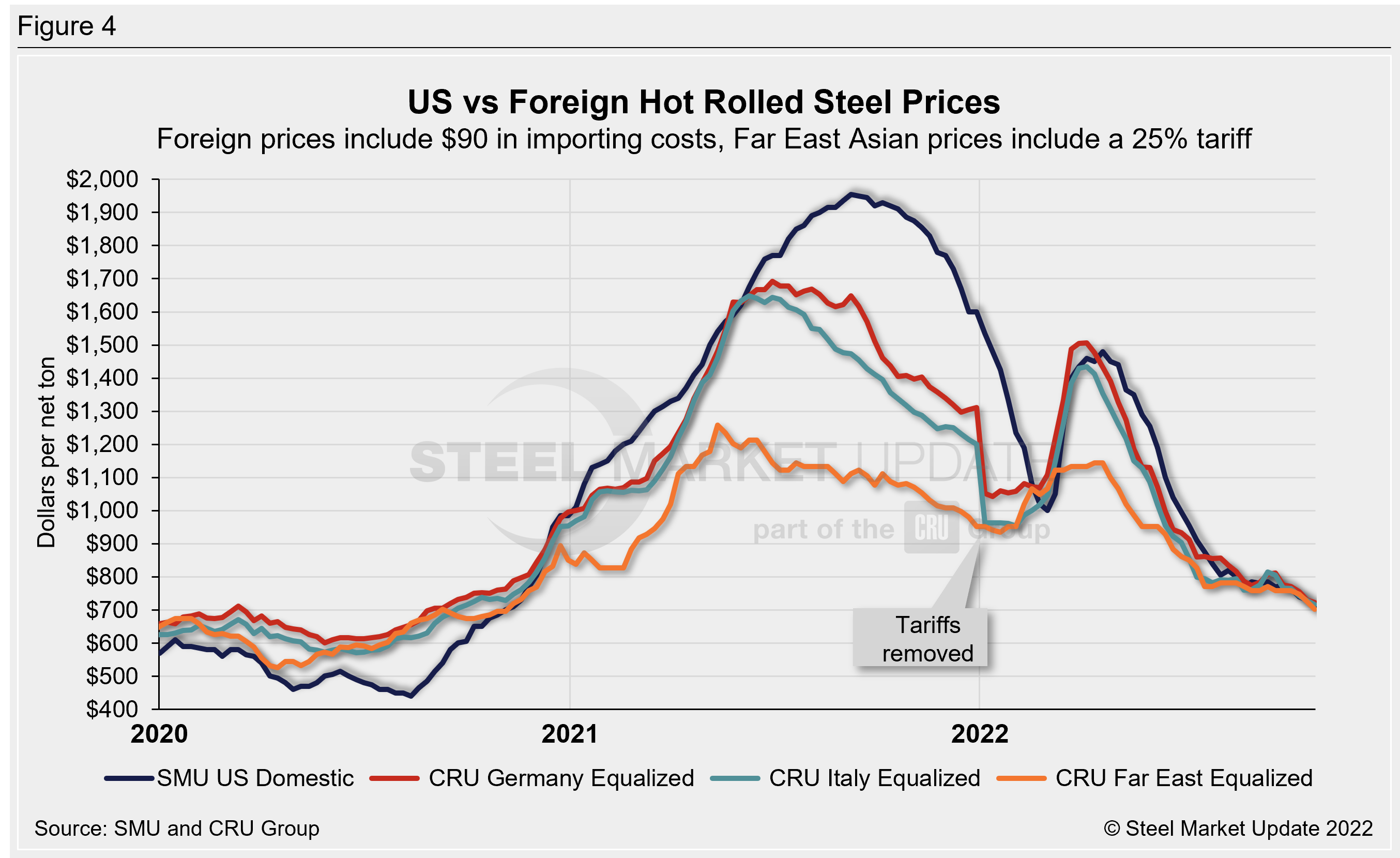 Effective Jan. 1, 2022, the traditional Section 232 tariff no longer applies to most imports from the European Union. It has been replaced by a tariff rate quota (TRQ). Therefore, the German and Italian price comparisons in this analysis no longer include a 25% tariff. SMU still includes the 25% S232 tariff on foreign prices from other countries. We do not include any antidumping (AD) or countervailing duties (CVD) in this analysis.
