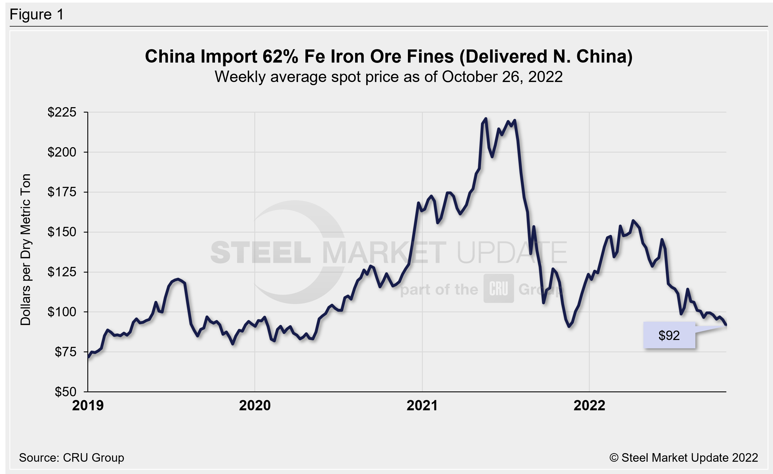 After rising to record-high levels last summer, the Chinese import price of 62% Fe content iron ore fines receded to near pre-Covid levels by the end of 2021. Prices increased from late 2021 through April of this year but have since steadily declined. Figure 1 shows the price of 62% Fe delivered North China at $92 per dry metric ton (DMT) as of Oct. 26. The last time iron ore prices were this low was nearly one year ago, in mid-November 2021 when they briefly reached a low of $91 per DMT. Prior to that instance, iron ore prices were last in this territory in May 2020. Prices have decreased 10% compared to levels three months ago and are 22% less than prices one year ago.