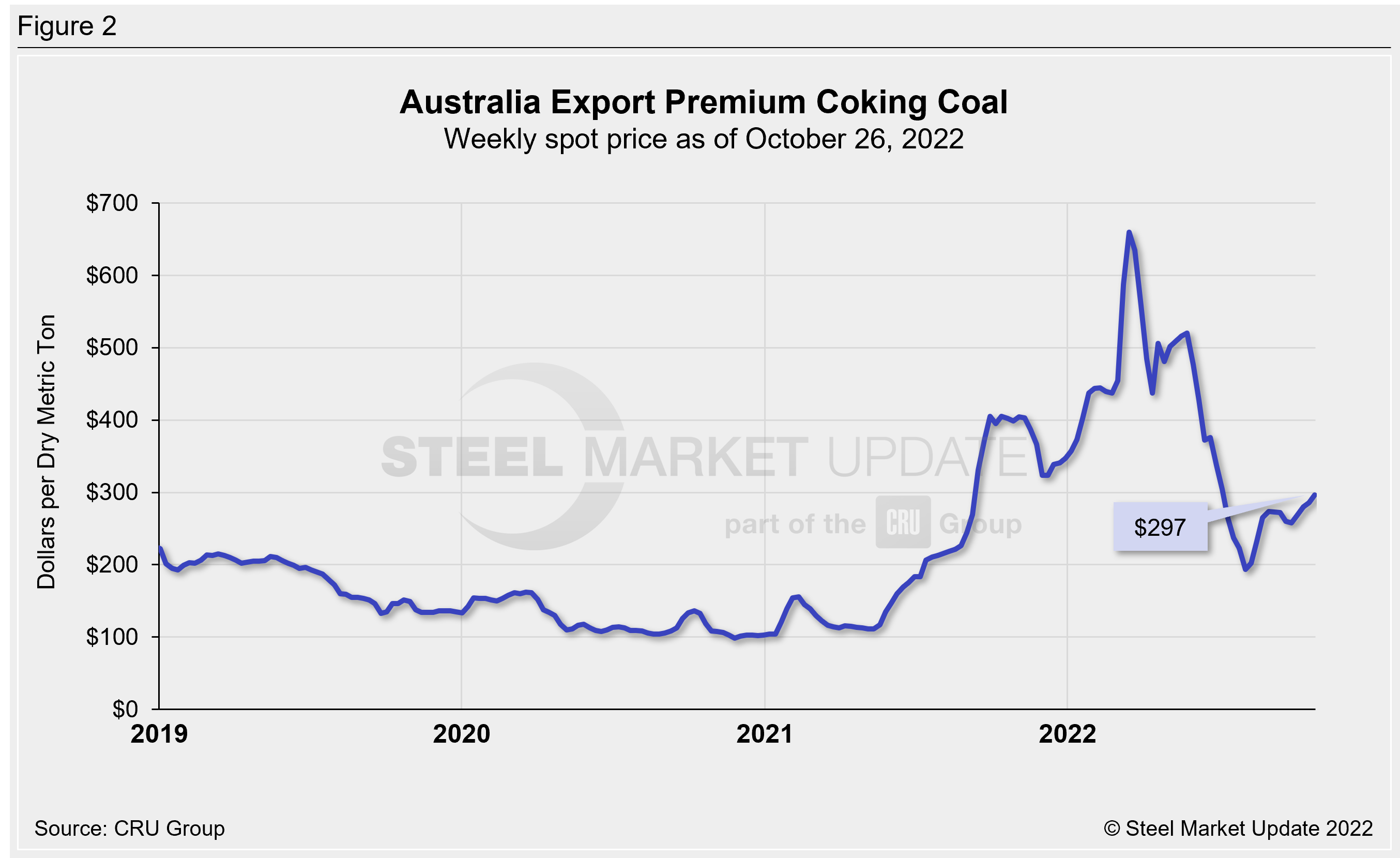 The price of premium hard coking coal FOB east coast of Australia surged in March of this year to a record high of $660 per DMT. Prices quickly declined in the following months, falling to a 13-month low of $193 per DMT in early August. Prices have since ticked back up; the latest price as of Oct. 26 is $297 per DMT. This is up 53% from the early-August low, but down 55% from the March peak (Figure 2). Prices are up 33% compared to three months prior, but down 26% from prices one year ago. For comparison, the average coking coal price between 2017–2020 was $172 per DMT.