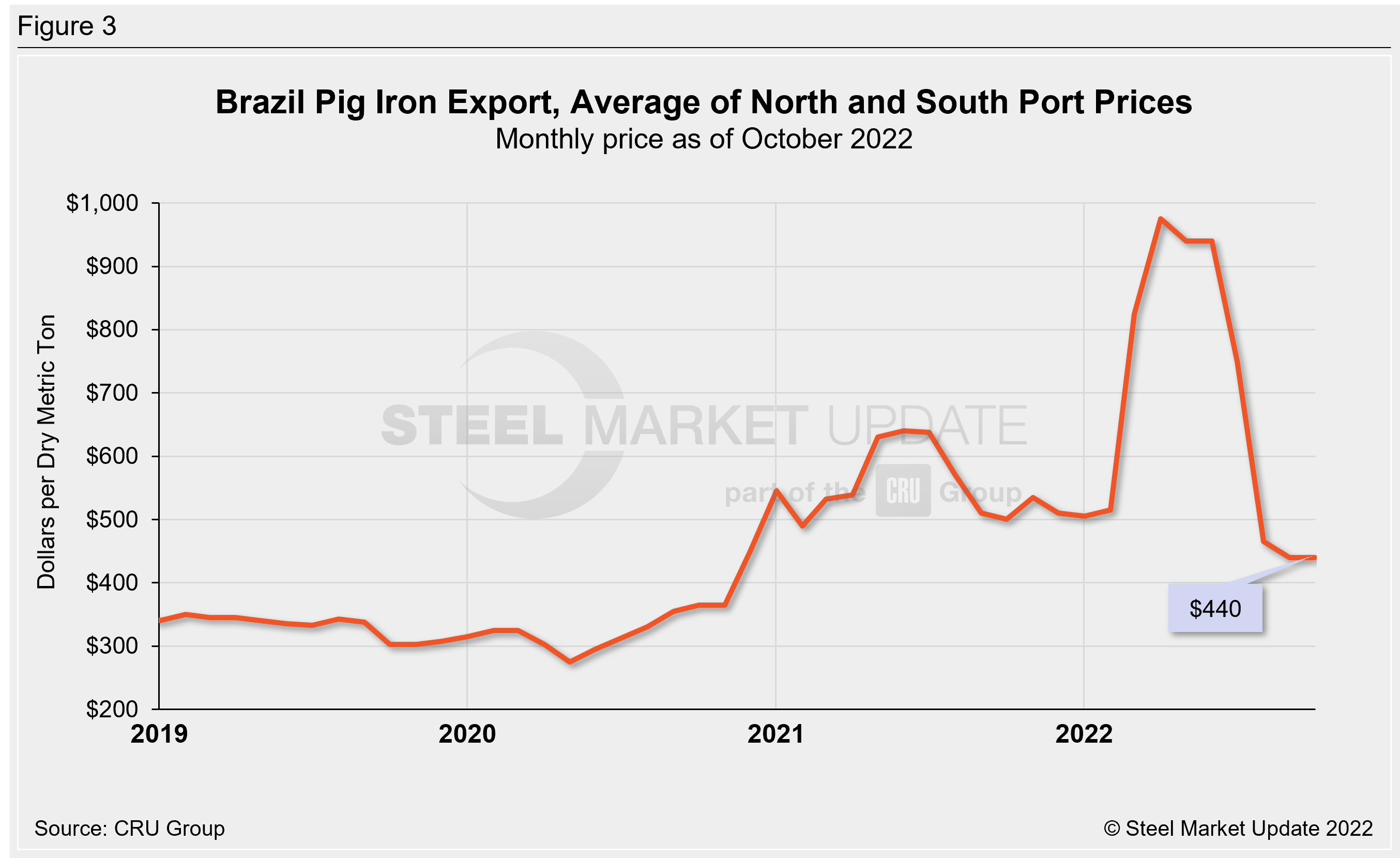 Pig iron prices had been elevated but relatively stable for most of 2021 and early 2022. Prices jumped 60% in March following the invasion of Ukraine by Russian forces — which limited or halted supplies from both nations. April saw record-high pig iron prices at $975 per DMT. Prices eased each month throughout September, holding steady this month at $440 per DMT. Prices are down 41% compared to three months ago and down 12% from one year prior. Recall that pig iron prices had reached a multi-year low of $275 per DMT in June 2020 (Figure 3).