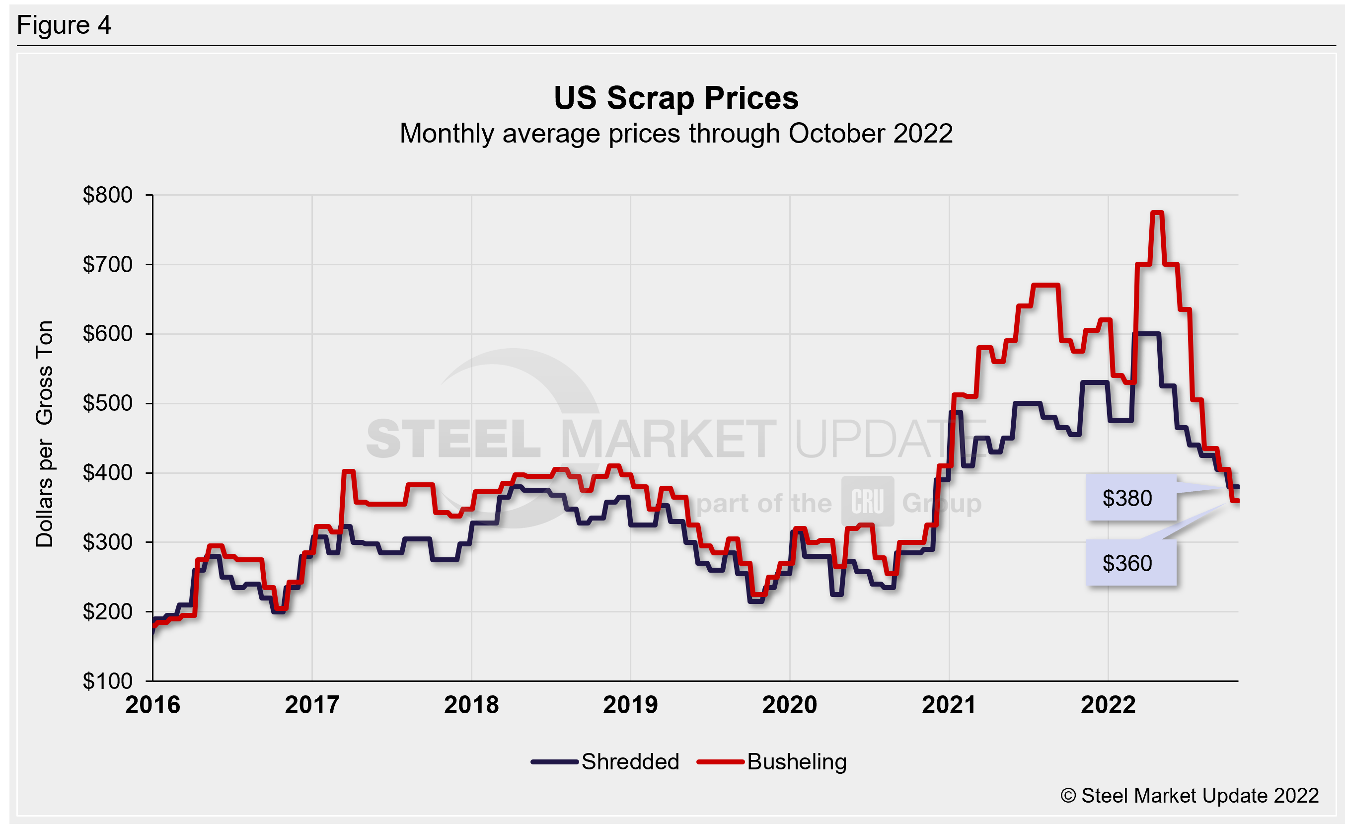 Scrap prices have declined each of the last six months. Busheling scrap prices fell $45 per gross ton to $360 per gross ton in October, while shredded scrap prices declined $25 to $380 per gross ton. It is not often that busheling scrap does not carry a premium price to shred, but that has been the case for the last two months. Recall that March and April saw record-high scrap prices, with busheling reaching $775 and shred hitting $600 per gross ton. Prior to 2021, the highest point for scrap prices over the last decade was $510 per gross ton for busheling in 2011 and $473 per gross ton for shredded in 2012. SMU sources expect scrap prices to marginally ease again in November.