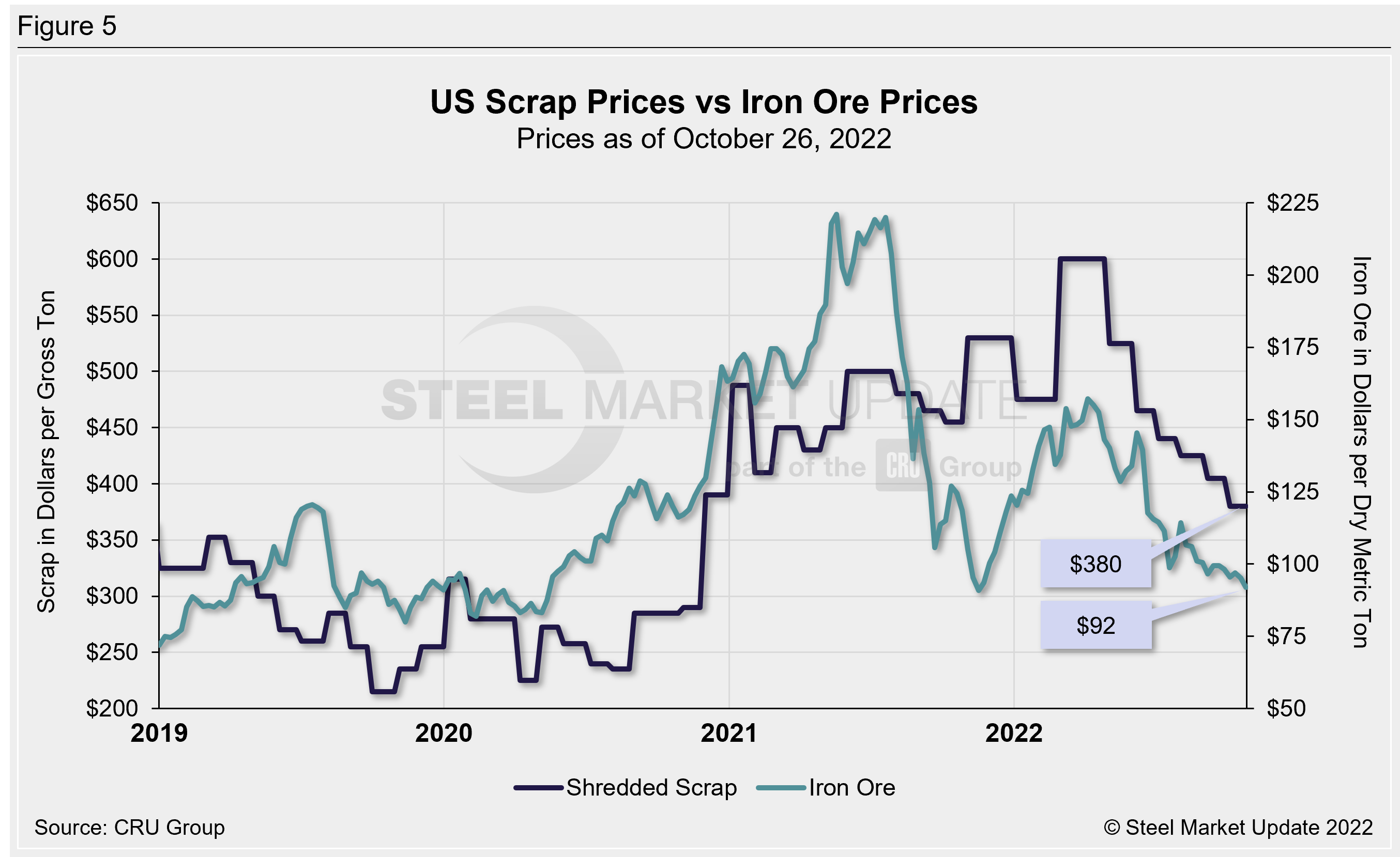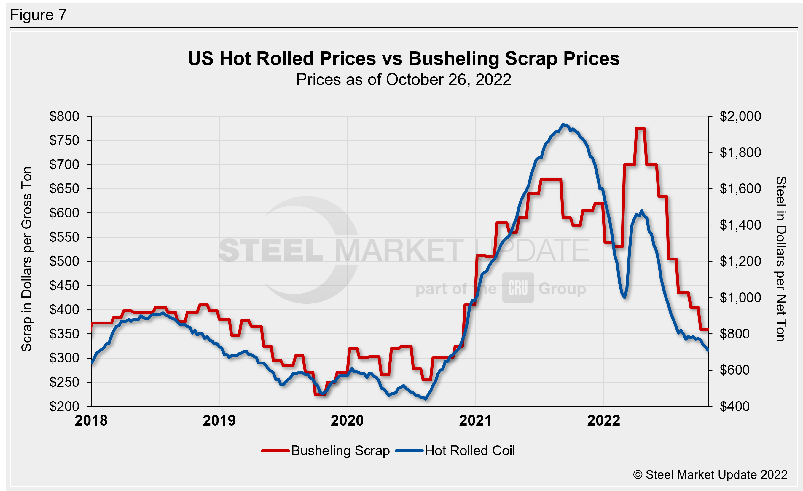 Figure 7 shows how the price of hot-rolled steel generally tracks with the price of busheling scrap. Bush has declined $415 per gross ton (54%) from the April peak and is roughly in line with pre-pandemic levels. As of Tuesday, Oct. 25, the SMU hot rolled price average decreased $20 per ton week-over-week to $710 per net ton. This is down $770 per net ton (52%) from the April 2022 peak, and the lowest price recorded since November 2020.