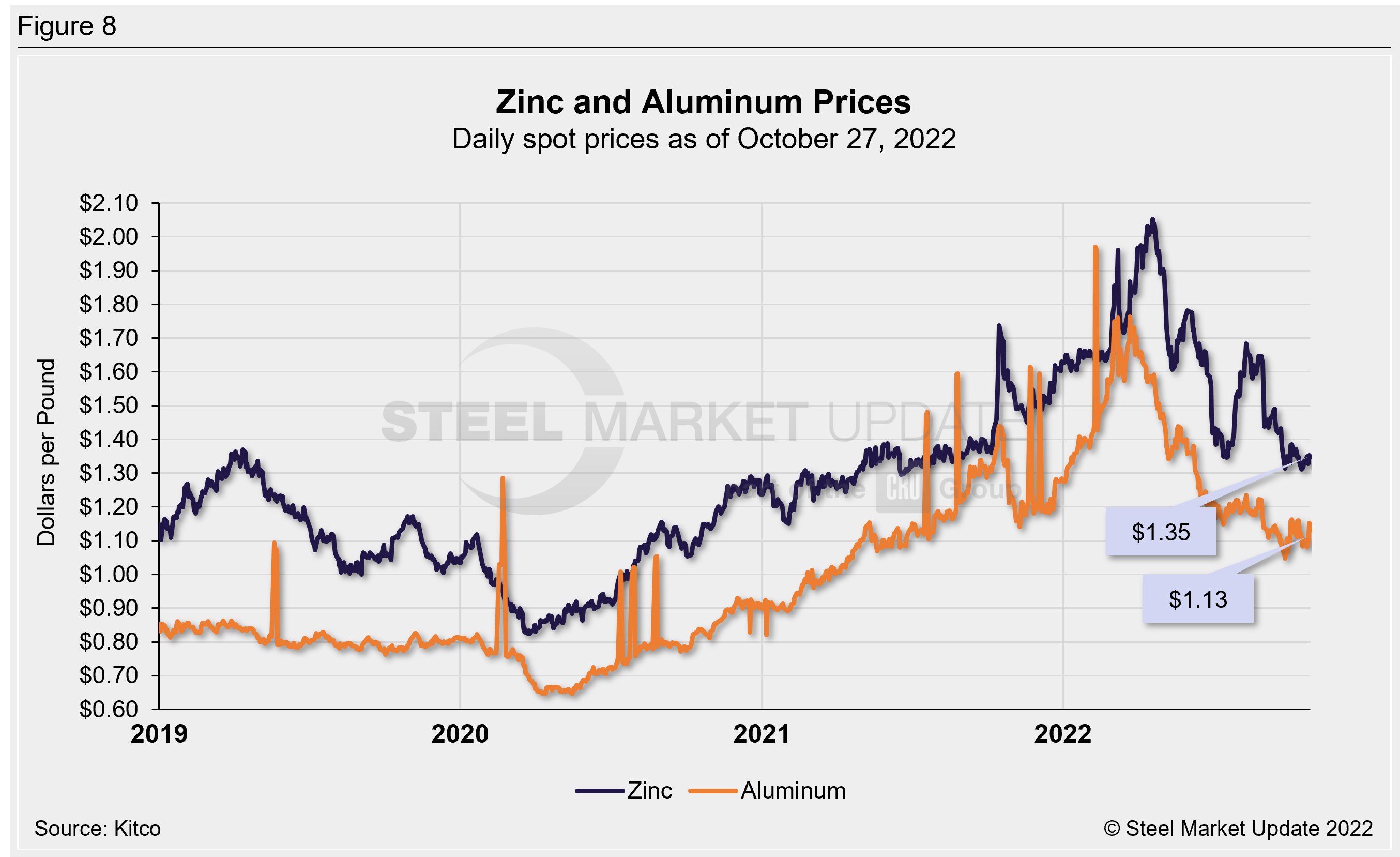 Aluminum prices, which factor into the price of Galvalume, had also been on the rise in 2021 and into early 2022, reaching a record-high of $1.76 per pound on March 23. (Note that aluminum spot prices often have large swings and return to typical levels within a few days, as seen in the graphic below. We do not consider those surges in our overall high/low comparisons.) Aluminum prices rapidly declined through June, somewhat stabilizing in July and August, then eased further through September. On Sept. 27 aluminum prices reached a 17-month low of $1.05 per pound. The latest LME cash price has risen to $1.13 per pound as of Oct. 27. Aluminum prices are up 8% from one month prior, down 5% from late July, and down 7% from prices one year prior.