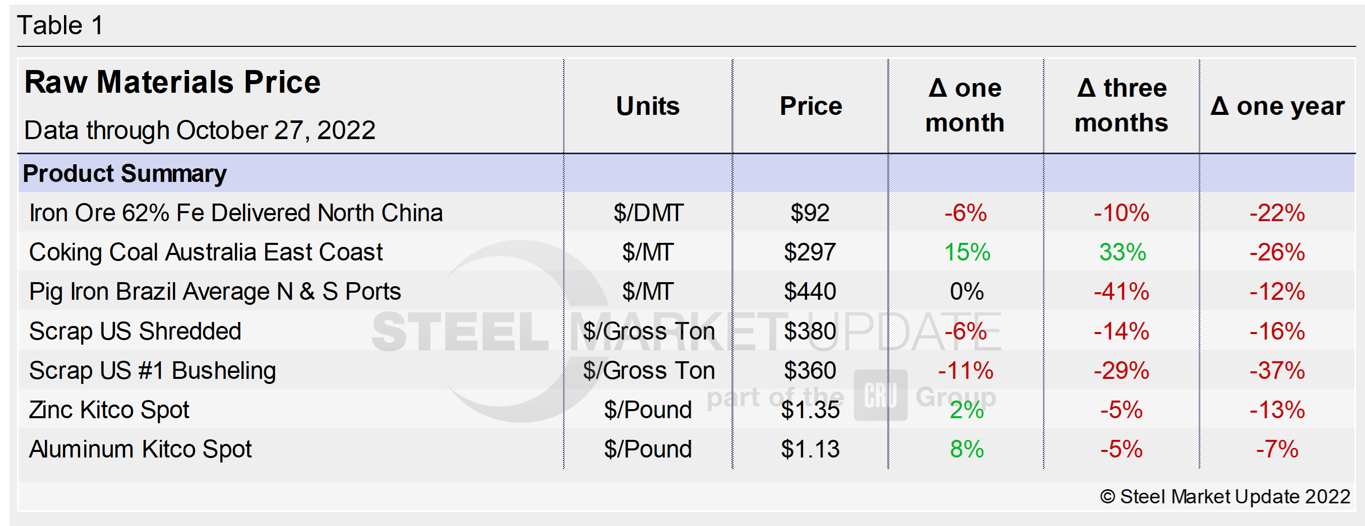 Prices of steelmaking raw material moved in differing directions over the last 30 days, according to Steel Market Update’s latest analysis. Through the latest data available as of Oct. 27, coking coal prices increased 15% over the last month, aluminum prices rose 8%, and zinc prices increased 2%. Pig iron prices remained stable. Busheling scrap prices decreased 11%, and shredded scrap and iron ore prices both fell 6%. Prior to October, we saw consecutive monthly declines for all products following the record-high levels seen earlier this year.