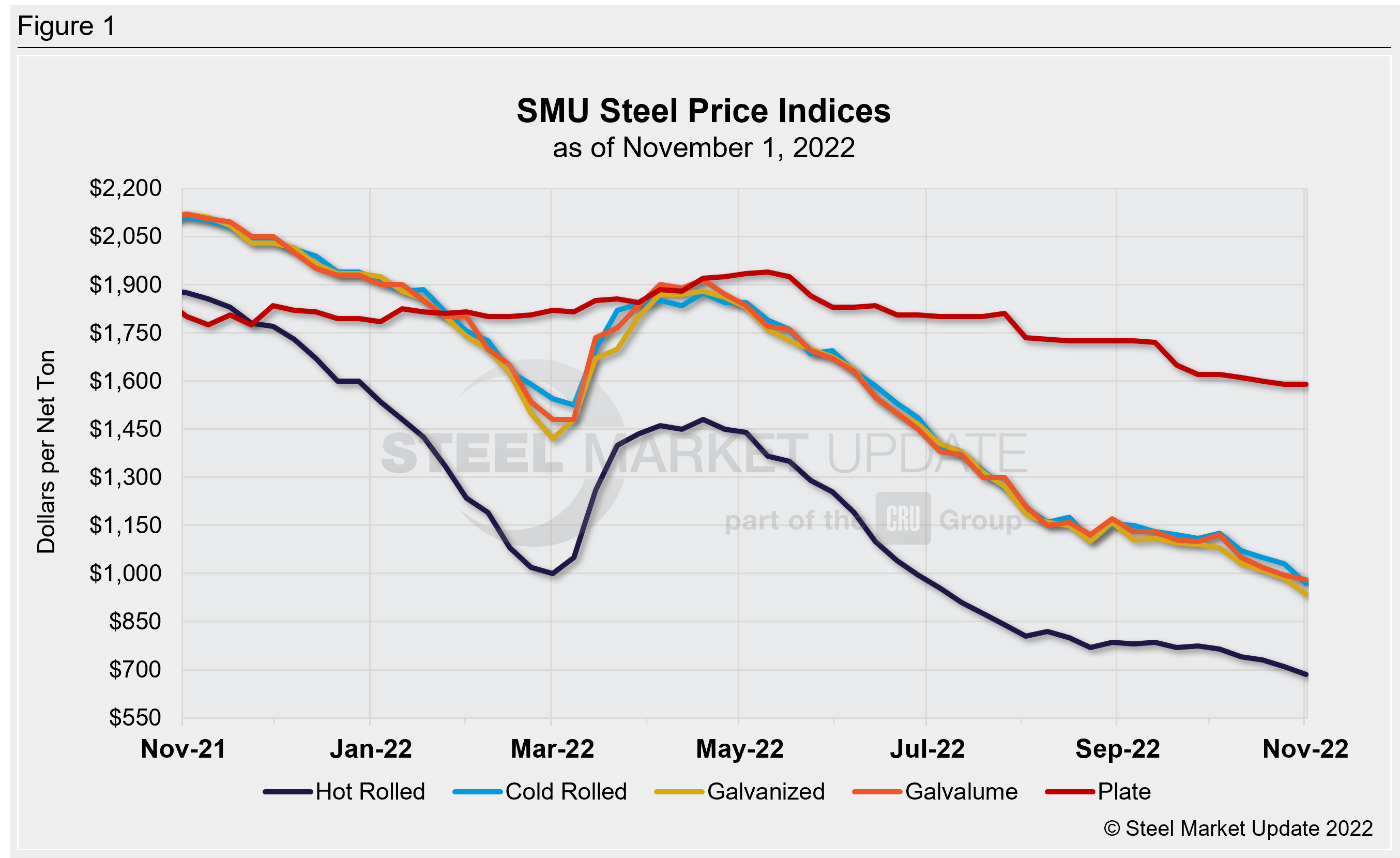 All price momentum indicators remain at Lower, with market participants predicting that flat-rolled steel prices could continue to fall into December before perking up as lead times stretch into the first quarter of 2023.