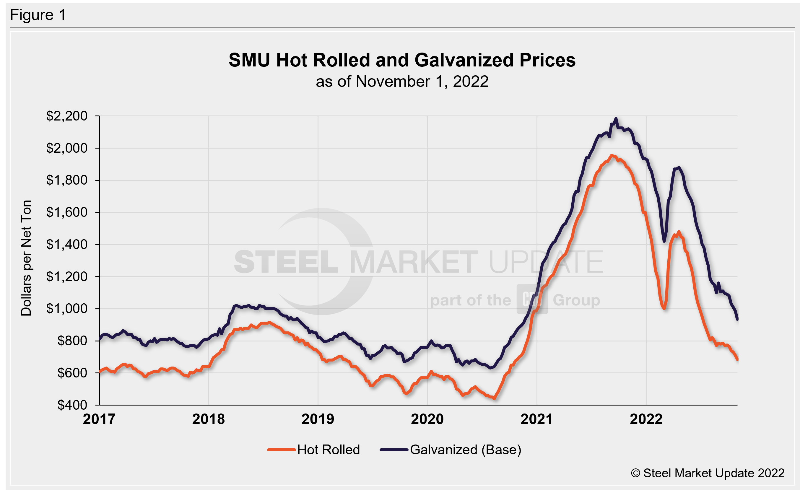 SMU’s HRC price averaged $685 per ton ($34.25 per cwt) on Tuesday of this week, the lowest level seen in over two years. Recall our index reached a record-high just over one year ago, peaking at $1,955 per ton in Sept. 2021. Our latest galvanized price index averaged $935 per ton ($46.75 per cwt) this week, having declined 26 of the past 28 weeks. Galvanized prices are now down to levels last seen in Nov. 2020, having peaked at $2,185 per ton last September.